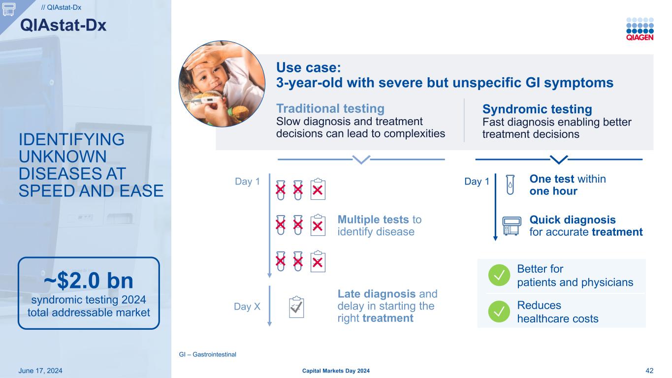 以SPEED和EASE的方式识别未知疾病2024年6月17日资本市场第2024天42个用例:3岁儿童有严重但不特异的胃肠道症状传统检测诊断和治疗决策缓慢可能导致复杂性综合征检测快速诊断可促成更好的治疗决策第1天x多项检测可识别疾病晚期诊断和延迟开始正确治疗一小时内一项检测快速诊断可获得准确治疗GI –胃肠道~20亿美元的综合征检测2024年总可寻址市场//QIAstat-DX QIAstat-DX更好地为患者和医生降低医疗保健成本第1天