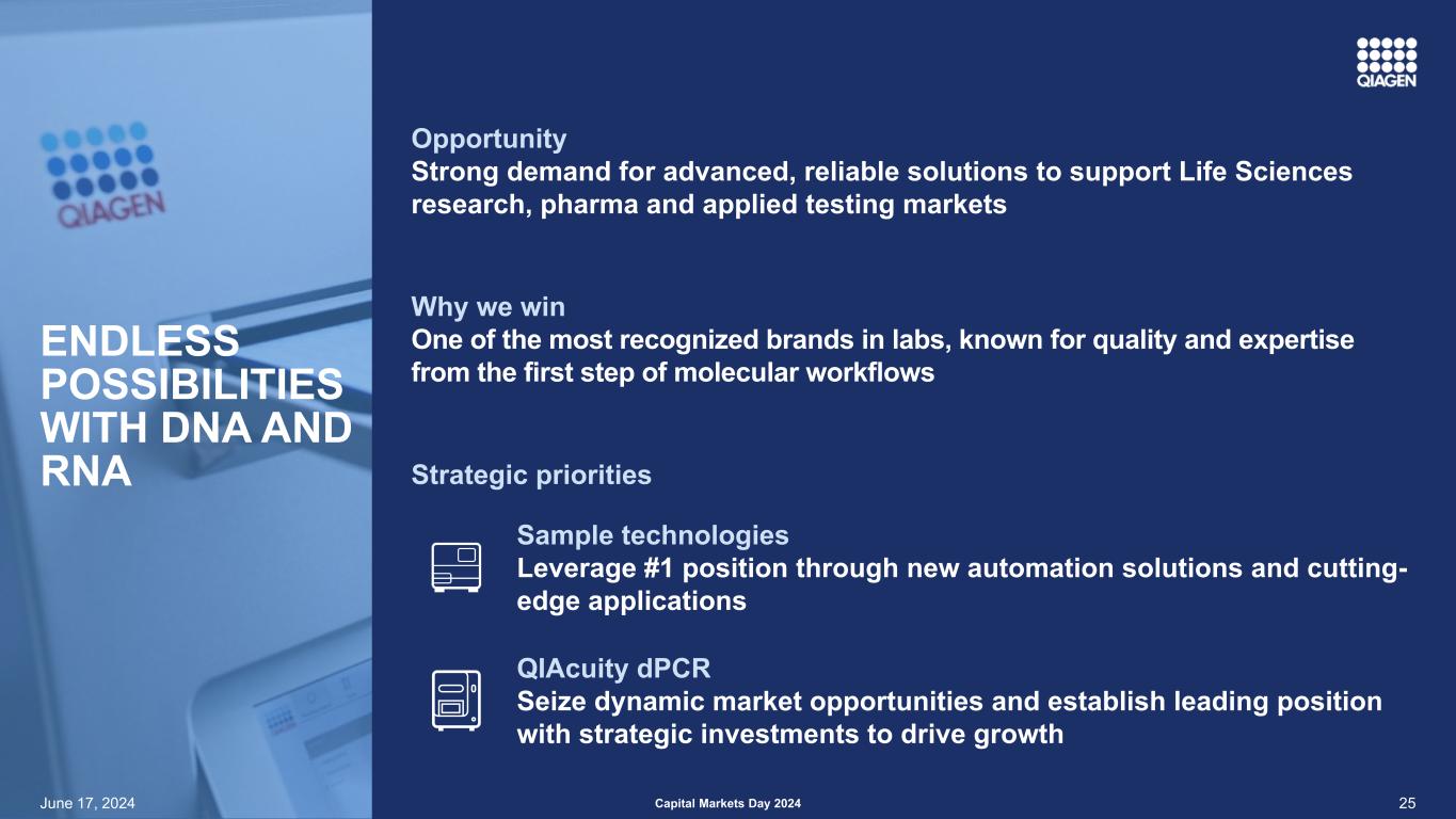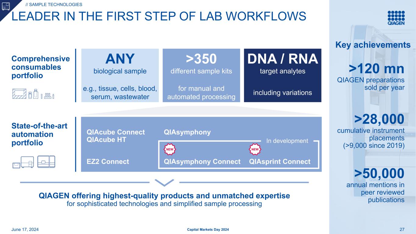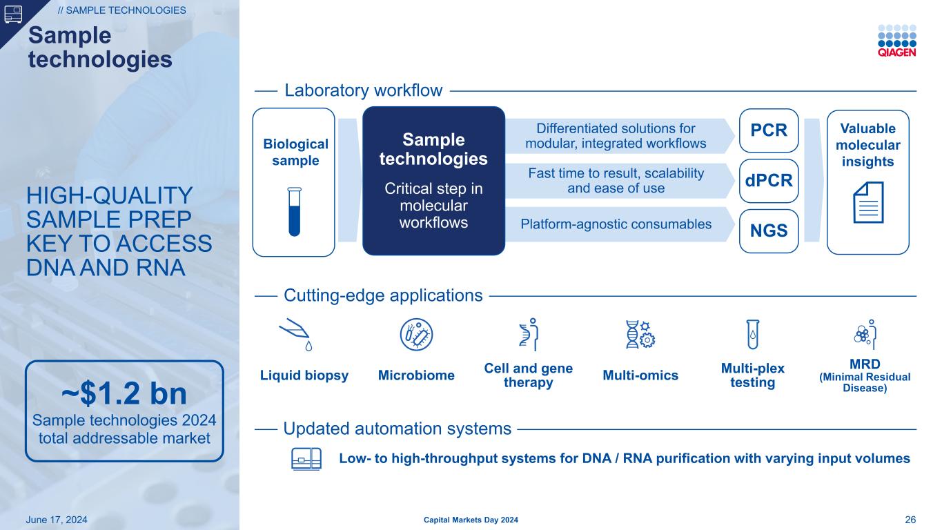 25机会对支持生命科学研究、制药和应用测试市场的先进、可靠解决方案的强烈需求为什么我们赢得了实验室中最受认可的品牌之一,以分子工作流程第一步的质量和专业知识而闻名2024年6月17日资本市场日2024年战略优先事项样本技术通过新的自动化解决方案和尖端应用利用# 1的位置QIAcuity DPCR抓住动态市场机会,通过战略投资建立领先地位,以DNA和RNA推动增长的无限可能