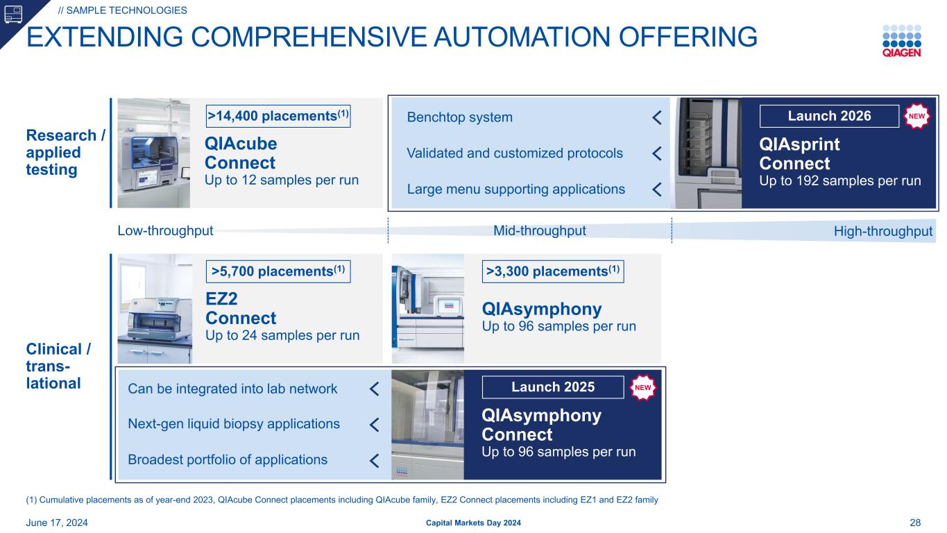 实验室工作流程第一步的领导者最先进的自动化产品组合全面的耗材组合任何生物样本,例如组织、细胞、血液、血清、废水> 350种不同的样本试剂盒,用于手动和自动化处理DNA/RNA目标分析物,包括变异QIAcube Connect QIAcube HTEZ2 Connect QIASymphony QIASymphony Connect QIAsprint Connect正在开发中6月17日,2024年资本市场日2024//样品技术27 > 28000个累计仪器放置(自2019年以来> 9000个)> 50000个年度在同行评审出版物中提及主要成就>每年售出1.2亿个QIAGEN制剂新QIAGEN提供最高质量的产品和先进技术和简化样品处理方面无与伦比的专业知识