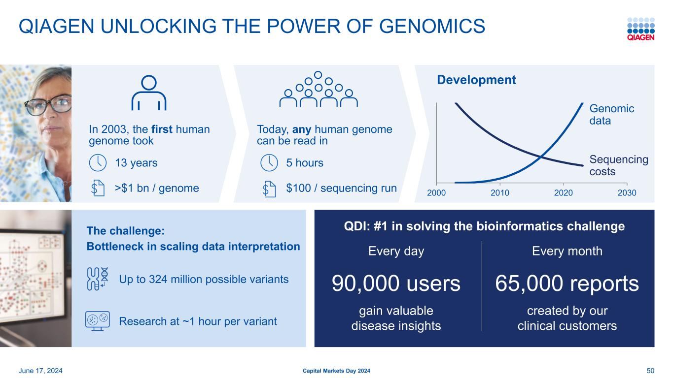 QIAGEN解锁GENOMICS 50发展的力量2003年,第一个人类基因组花了13年2000年201020202030测序花费基因组数据2024年6月17日资本市场日2024今天,任何人类基因组都可以在5小时内读取QDI:# 1在解决生物信息学挑战中,每天有90,000名用户获得宝贵的疾病见解,每月有65,000份由我们的临床客户创建的报告挑战:扩展数据解释的瓶颈高达3.24亿个可能的变异研究,每个变异约1小时100美元/测序运行> 10亿美元/基因组