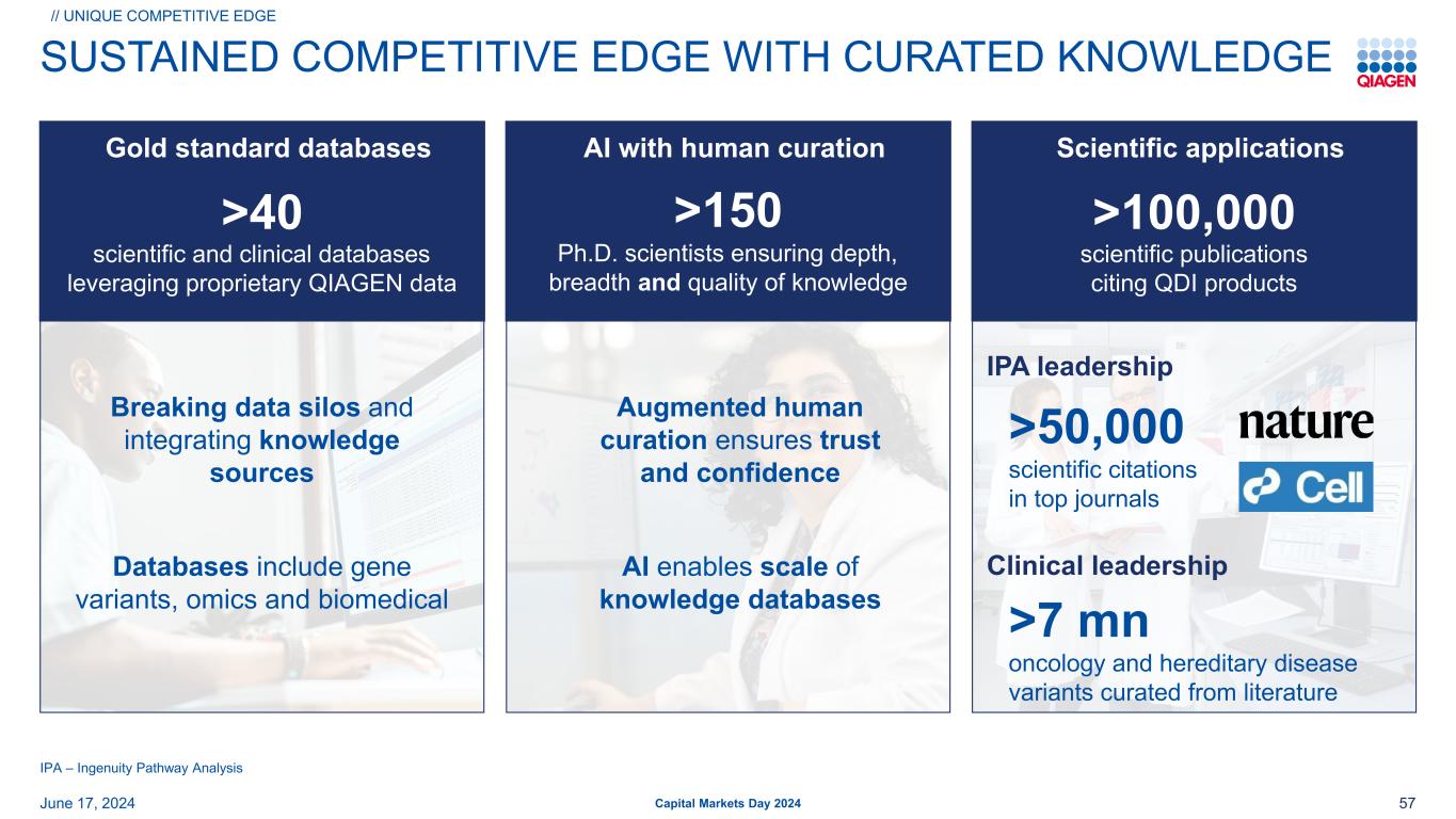 2024年6月17日资本市场日2024第57届保持竞争优势,培养知识>顶级期刊科学引用50,000次IPA领导力临床领导力> 40个科学和临床数据库利用专有QIAGEN数据黄金标准数据库IPA – Ingenuity Pathway Analysis > 150名博士科学家确保深度,知识AI的广度和质量与人类策展AI使知识数据库规模化增强人类策展确保信任和信心打破数据孤岛,整合知识源//独特的竞争优势> 700万个从文献中策划的肿瘤学和遗传病变异> 10万份引用QDII产品的科学出版物科学应用数据库包括基因变异、组学和生物医学