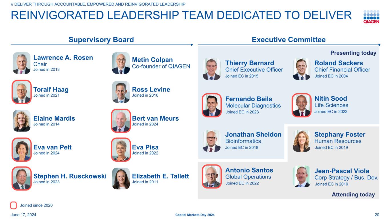 致力于交付20架飞机的重振领导团队于2015年加入EC Thierry Bernard首席执行官于2018年加入EC Jonathan Sheldon BioInformatics今天出席了今天的演讲,Toralf Haag于2021年加入丨Elaine Mardis 丨Stephen H. Rusckowski于2014年加入丨Eva van Pelt于2024年加入丨Stephen H. Rusckowski TERM2于2023年加入丨罗斯·莱文于2016年加入丨伯特·范·梅尔斯于2024年加入丨伊娃·比萨于2022年丨Elizabeth E. Tallett Elizabeth E. Tallett于2011年加入丨Lawrence A. Rosen Lawrence A. Rosen主席于2013年加入丨Metin Colpan Metin Colpan QIAGEN Capital Markets Day的联合创始人20246月17日,2024自2020年加入监事会执行委员会于2023年加入EC Fernando Beils Molecular Diagnostics于2022年加入EC Antonio Santos全球运营于2004年加入EC Roland Sackers首席财务官于2023年加入EC Nitin Sood Life Sciences于2019年加入EC Stephany Foster人力资源于2019年加入EC Jean-Pascal Viola Corp Strategy/Bus。开发人员//通过问责制、赋权和重振领导力进行交付