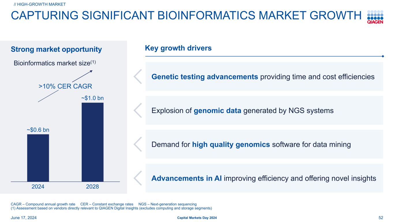 20242028 > 10% CER CAGR生物信息学市场规模(1)强劲的市场机会关键增长动力基因检测进步提供时间和成本效益对用于数据挖掘的高质量基因组学软件的需求NGS系统生成的基因组数据提高效率并提供新颖见解6月17日,2024年资本市场日2024年捕捉重大生物信息市场增长52//高增长市场CAGR –复合年增长率CER –不变汇率NGS –下一代测序(1)基于与QIAGEN Digital Insights直接相关的供应商(不包括计算和存储领域)的评估~6亿美元~10亿美元对由NGS系统产生的基因组数据的爆炸式增长AI方面的进步提高了效率并提供了新颖的见解