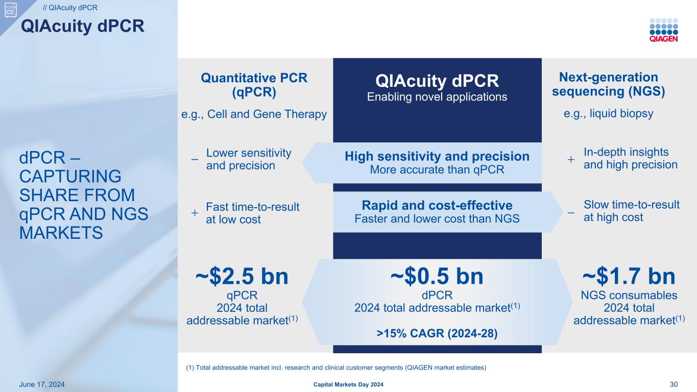 推动中期增长的重点战略2024年6月17日资本市场日29//SAMPLE TECHNOLOGIES ≥ 7.5亿美元样本技术净销售额CER目标(2028)更新中通量自动化平台与下一代应用更新旗舰仪器杠杆> 3,300个全球布局QIASymphony Connect Launch 2025NEW进入高通量自动化市场进行研究QIASPrint Connect引入基于流行的磁珠耗材的新系统构建Launch 2026NEW Expand in state-art applications with new consumables extends # 1 position with improved handling through new consumables kits MicrobiomeLiquid biopsy Pathogen detection CER – constant exchange rates
