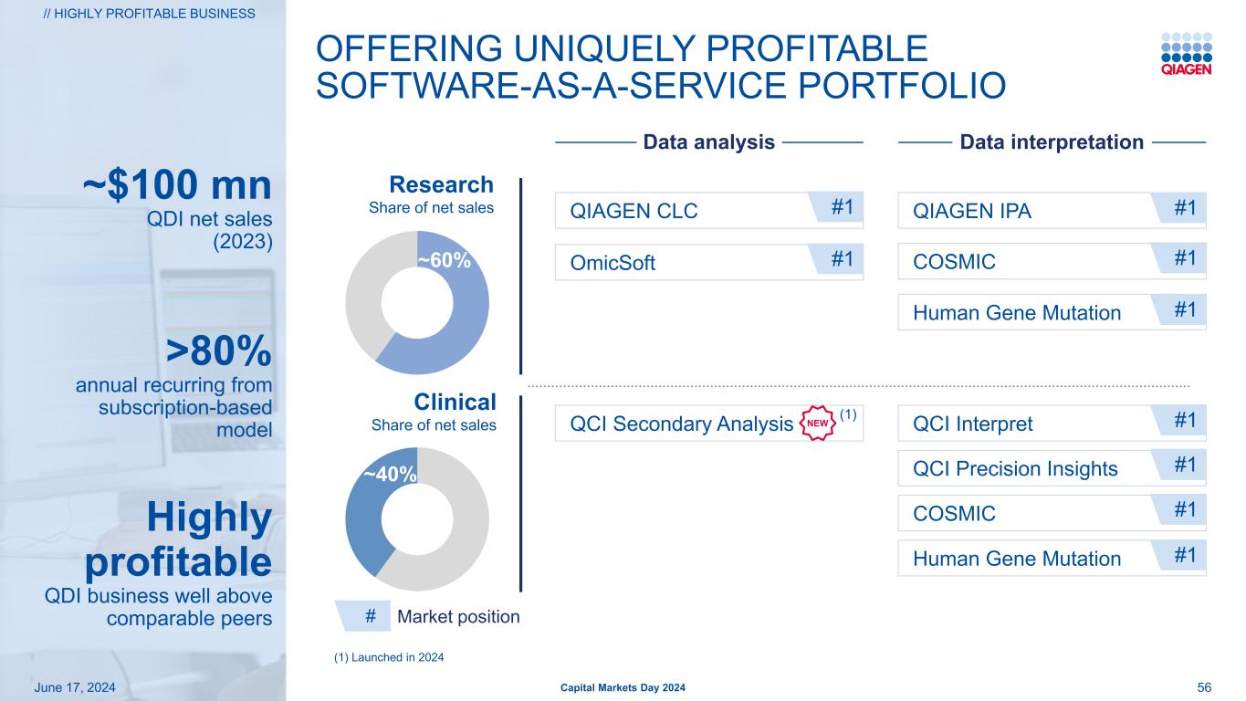 资本市场日2024~1亿美元QDII净销售额(2023)56 > 80%年度经常性来自订阅模式高盈利QDII业务远高于可比同行市场地位研究净销售额份额QCI二次分析COSMIC QCI Precision Insights QCI解读OmicSoft COSMIC人类基因突变QIAGEN IPAQIAGEN CLC提供独特盈利软件即服务投资组合临床净销售额份额# 1 # 1 # 1 # 1 # 1 # 1人类基因突变# 1 # 1//高盈利业务# 2024年6月17日# 1(1)2024年推出~40%~60%新(1)数据分析数据解读