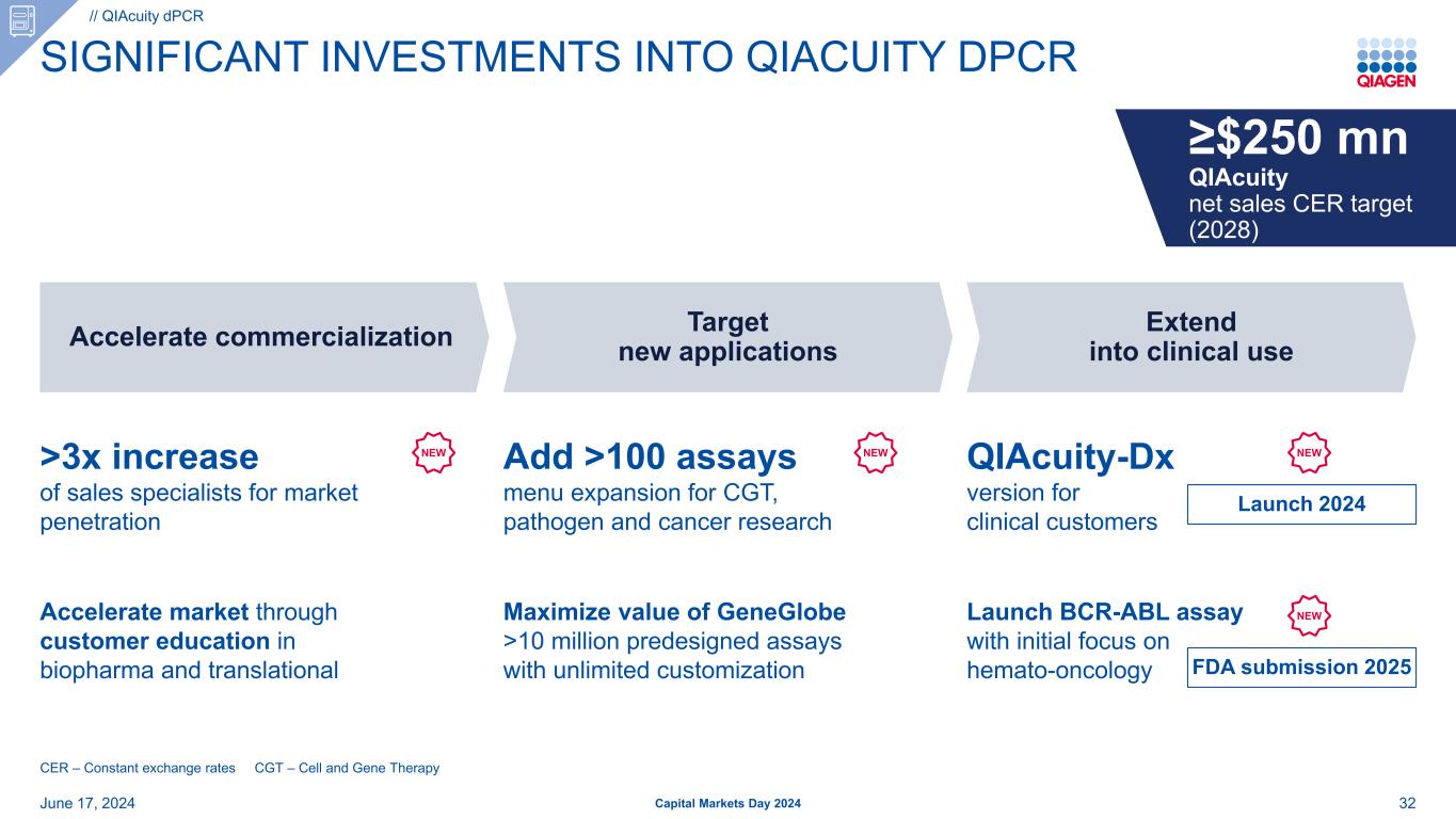 对QIACUITY DPCR 32资本市场日2024新增> 100个CGT、病原体和癌症研究的检测菜单扩展最大化GeneGlobe的价值> 1000万个预先设计的检测,无限定制>增加3倍销售专家以促进市场渗透通过生物制药和转化的客户教育加速市场6月17日,2024 QIAcuity-DX版面向临床客户推出BCR-ABL检测,初步侧重于血液肿瘤学加速商业化目标新应用扩展到临床使用//QIAcuity DPCR新新CER –固定汇率CGT –细胞和基因治疗≥ 2.5亿美元QIAcuity净销售额CER目标(2028)FDA提交2025新推出2024新