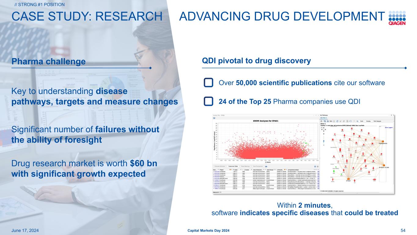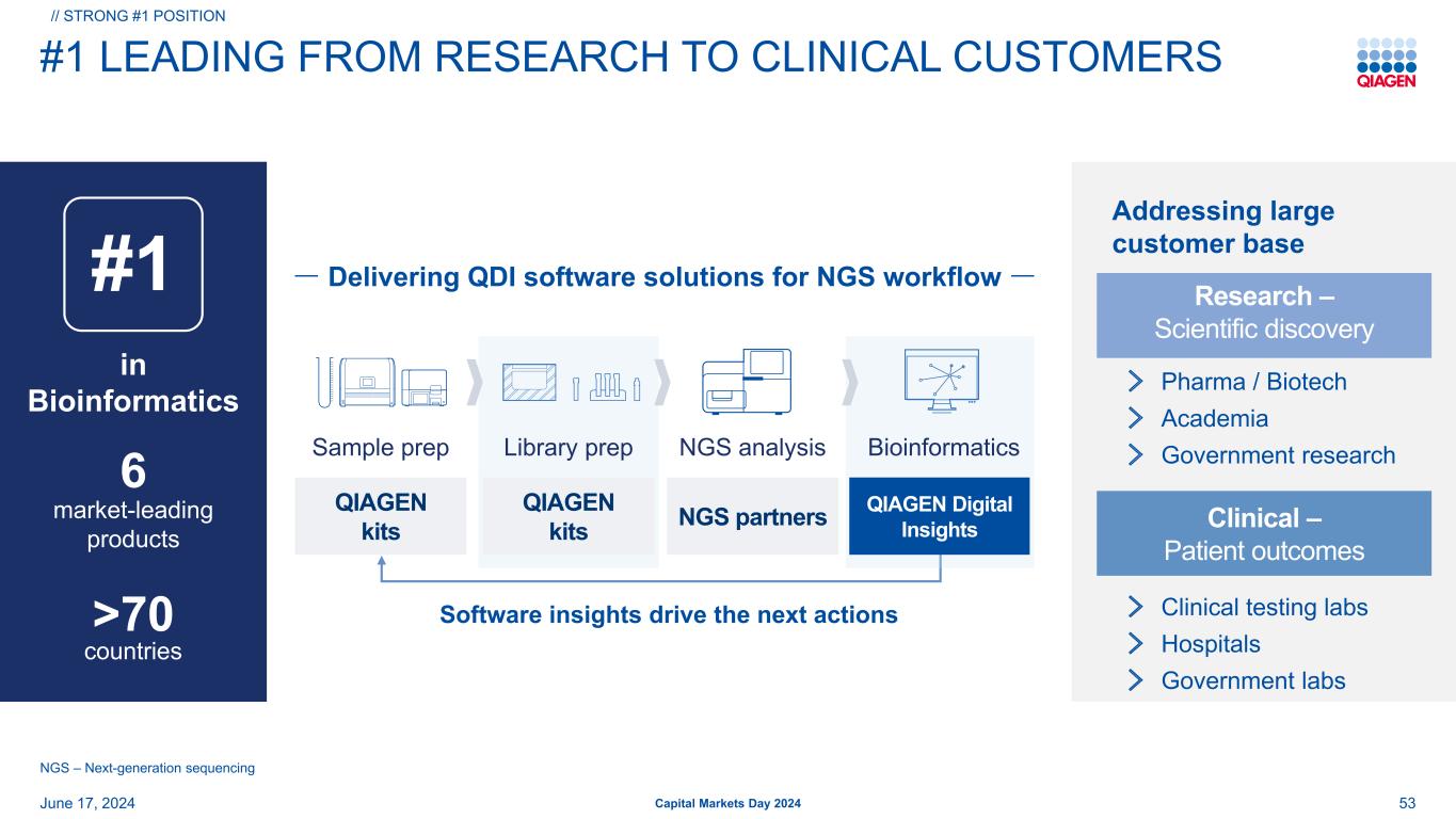 # 1从研究到临床客户的领先地位2024年6月17日资本市场日第2024届53 # 1在生物信息学中丨NGS –下一代测序软件洞察推动下一步行动库prep生物信息NGS分析Sample prep QIAGEN Digital Insights QIAGEN Kits 丨NGS partnersQIAGEN Kits面向庞大客户群6个市场领先的产品> 70个国家研究–科学发现临床–患者结果制药/生物技术研究院政府研究临床测试实验室医院政府实验室//Strong # 1位置为NGS工作流程提供QDII软件解决方案
