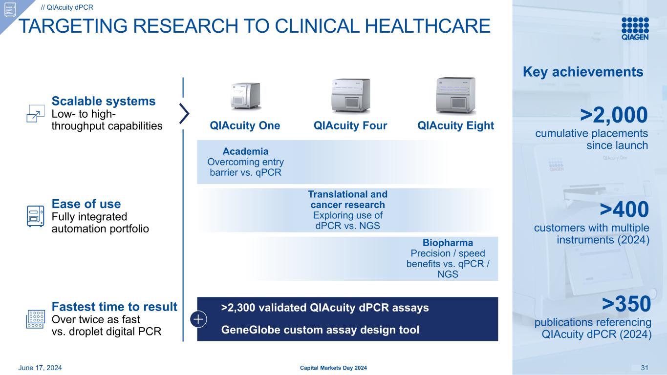 dPCR –从qPCR和NGS市场捕获份额2024年6月17日30定量PCR(qPCR),例如,细胞和基因治疗下一代测序(NGS),液体活检QIACuity DPCR支持新的应用~17亿美元的NGS耗材2024年总潜在市场(1)更低的灵敏度和精确度深入洞察和高精度高灵敏度和精确度比QPCR更准确以低成本快速得出结果时间慢以高成本得出结果时间快以高成本快速且具有成本效益比NGS~25亿美元的qPCR 2024年总潜在市场(1)~5亿美元的dPCR 2024年总潜在市场(1)> 15% CAGR(2024-28)//QIACuity DPCR Capital Markets Day 2024 QIACuity DPCR(1)总潜在市场包括研究和临床客户细分(QIAGEN市场估计)