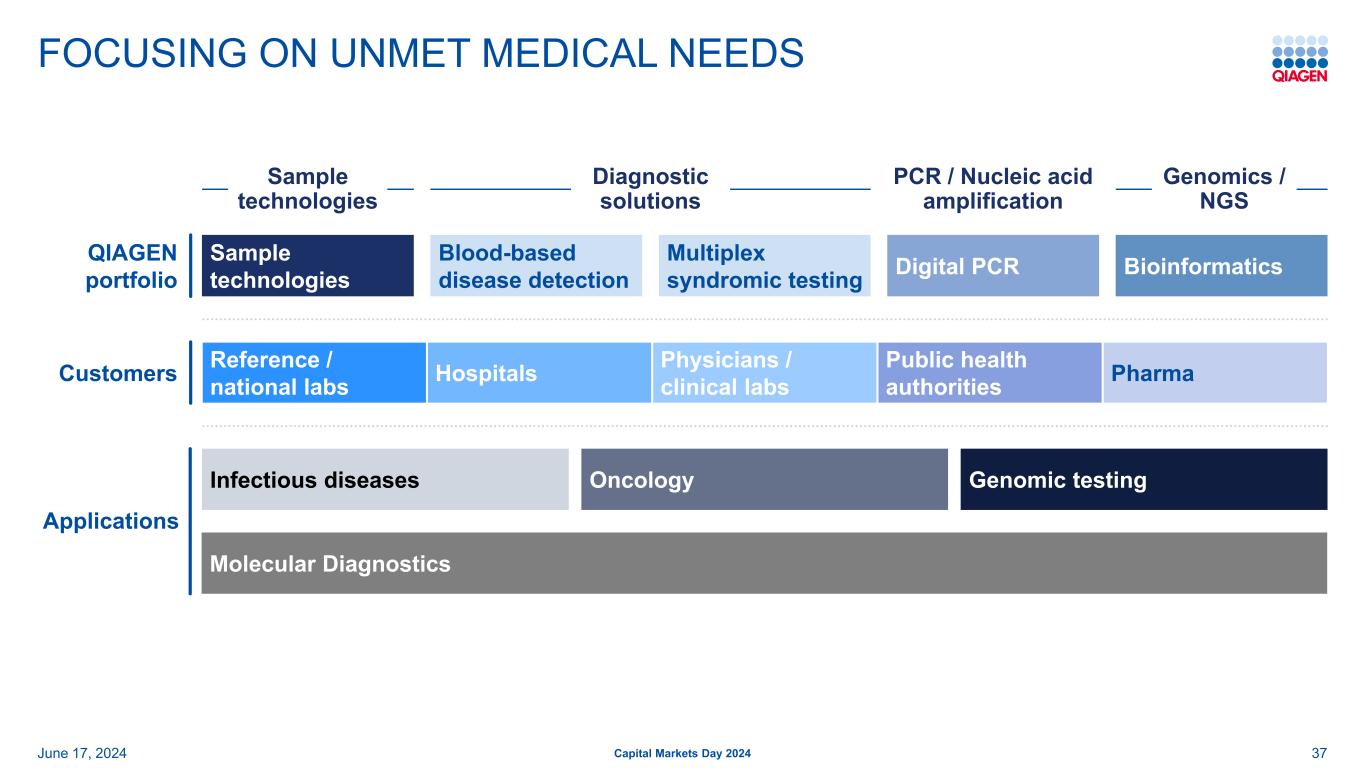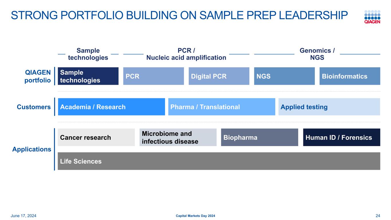 基于SAMPLE PREP领导力的强大投资组合建设2024年6月17日24资本市场日2024年应用测试Pharma/TranslationalAcademia/ResearchCustomers样本技术PCR数字PCR NGS BioInformaticsQIAGEN组合PCR/核酸扩增基因组学/NGS生命科学微生物组和传染病人类ID/法医学BioPharmaCancer研究样本技术