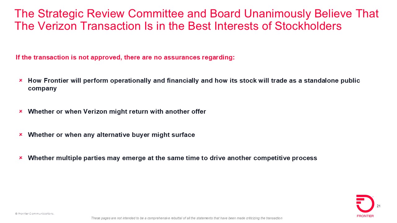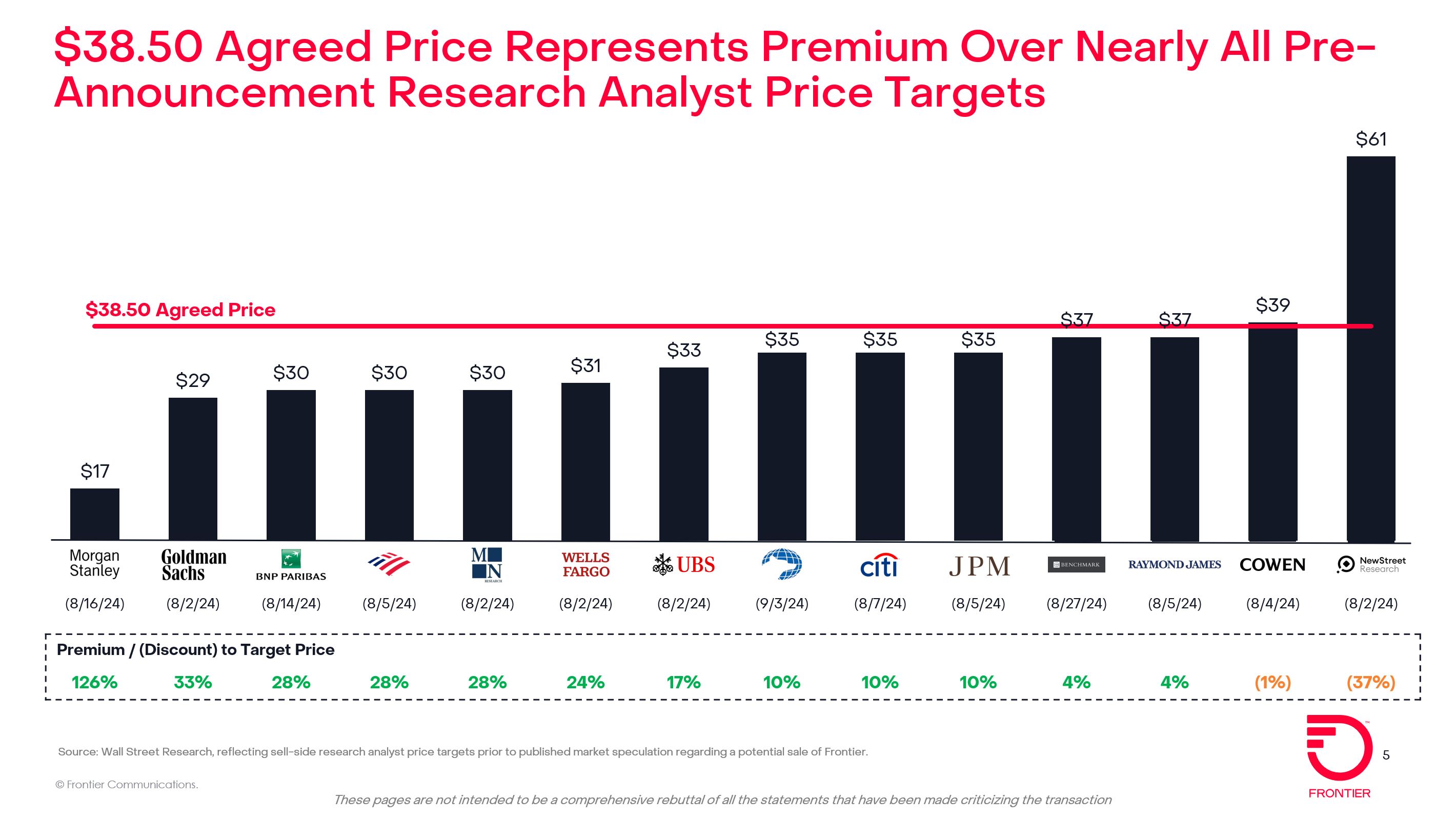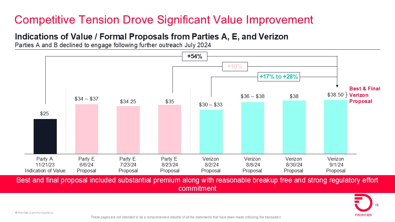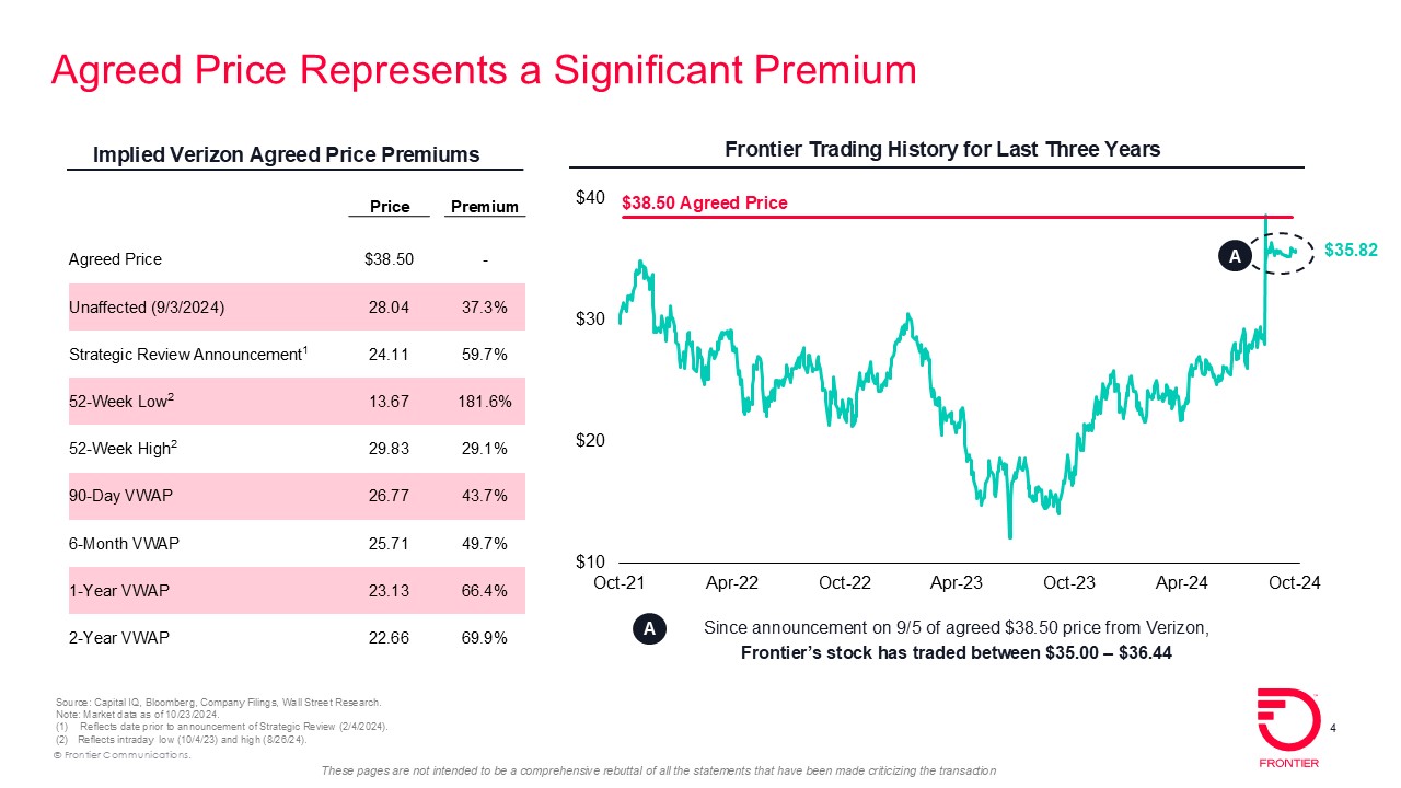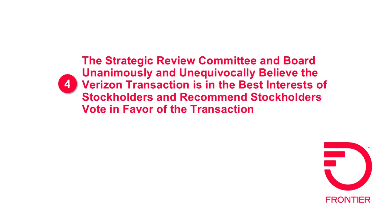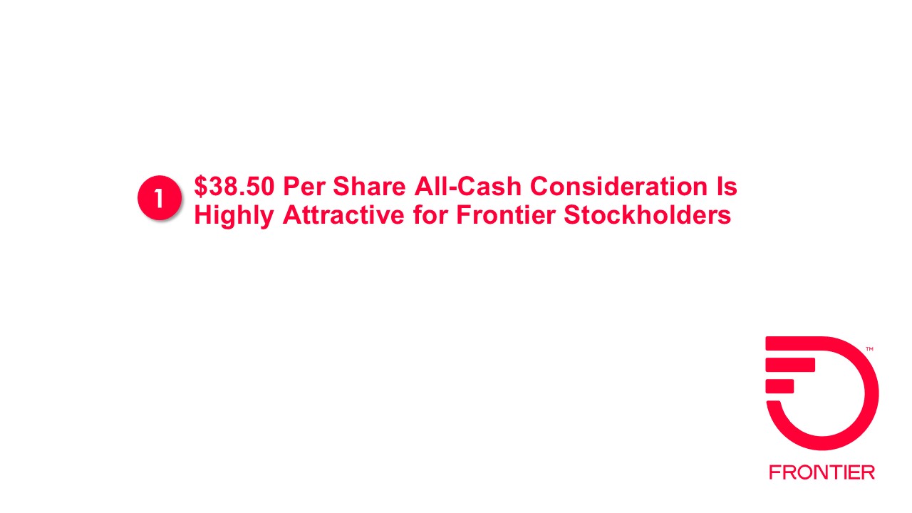 威瑞森通信提出的每股38.50美元的最佳和最终的全现金报价极具吸引力,并为股东创造了可观的价值,这反映出该公司较Frontier公告前的价格有37%的溢价,也较Frontier历史股票表现的所有其他衡量标准有显着溢价。