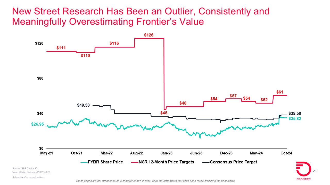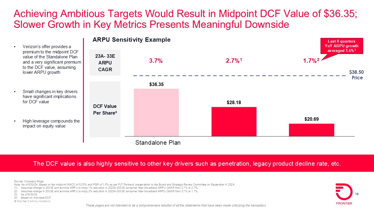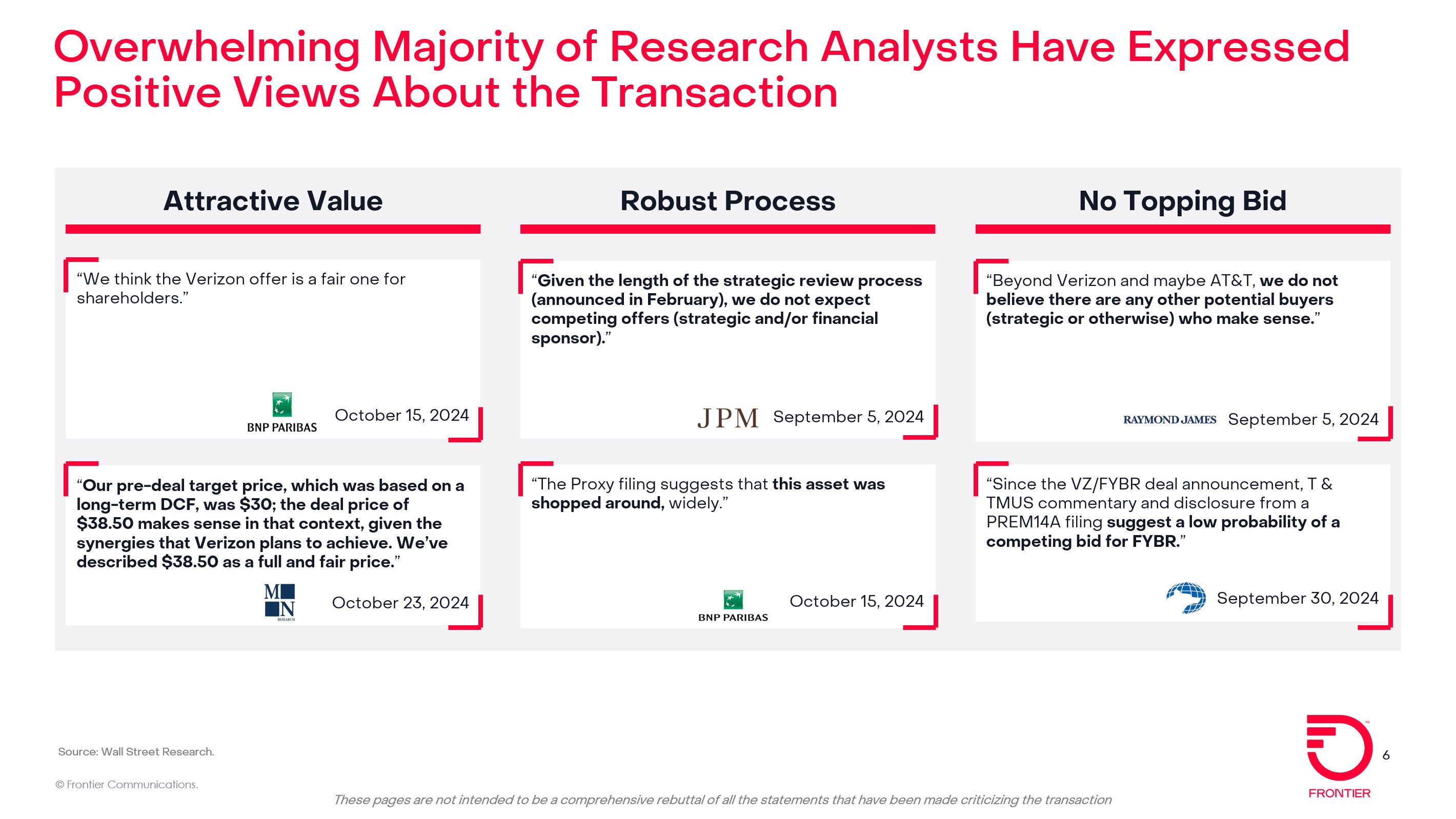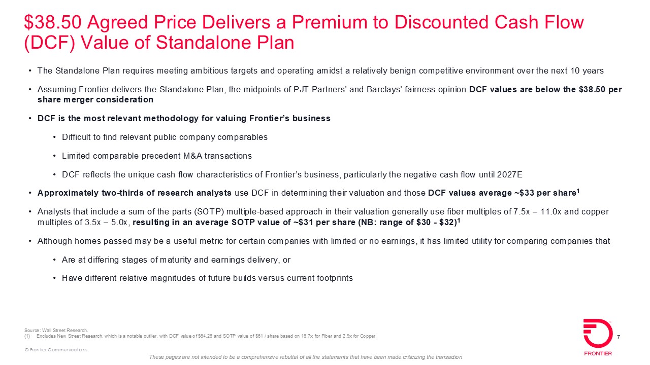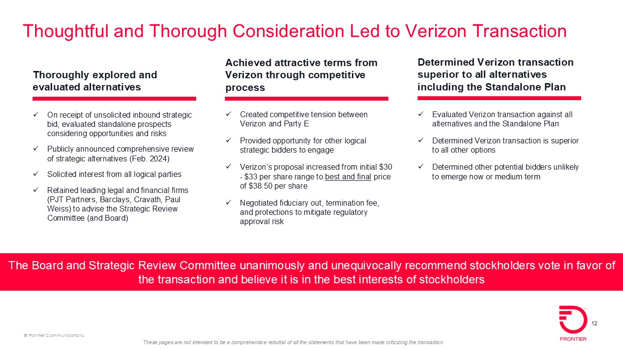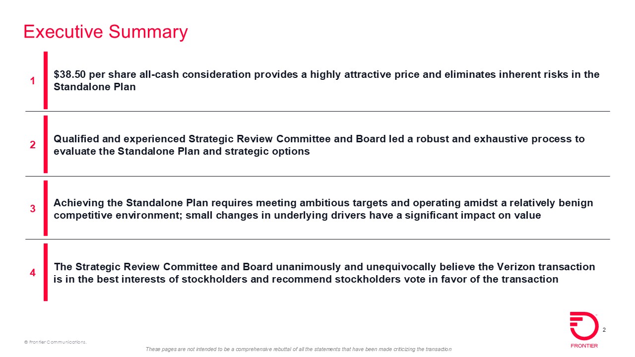 威瑞森通信提出的每股38.50美元的最佳和最终的全现金报价极具吸引力,并为股东创造了可观的价值,这反映出该公司较Frontier公告前的价格有37%的溢价,也较Frontier历史股票表现的所有其他衡量标准有显着溢价。