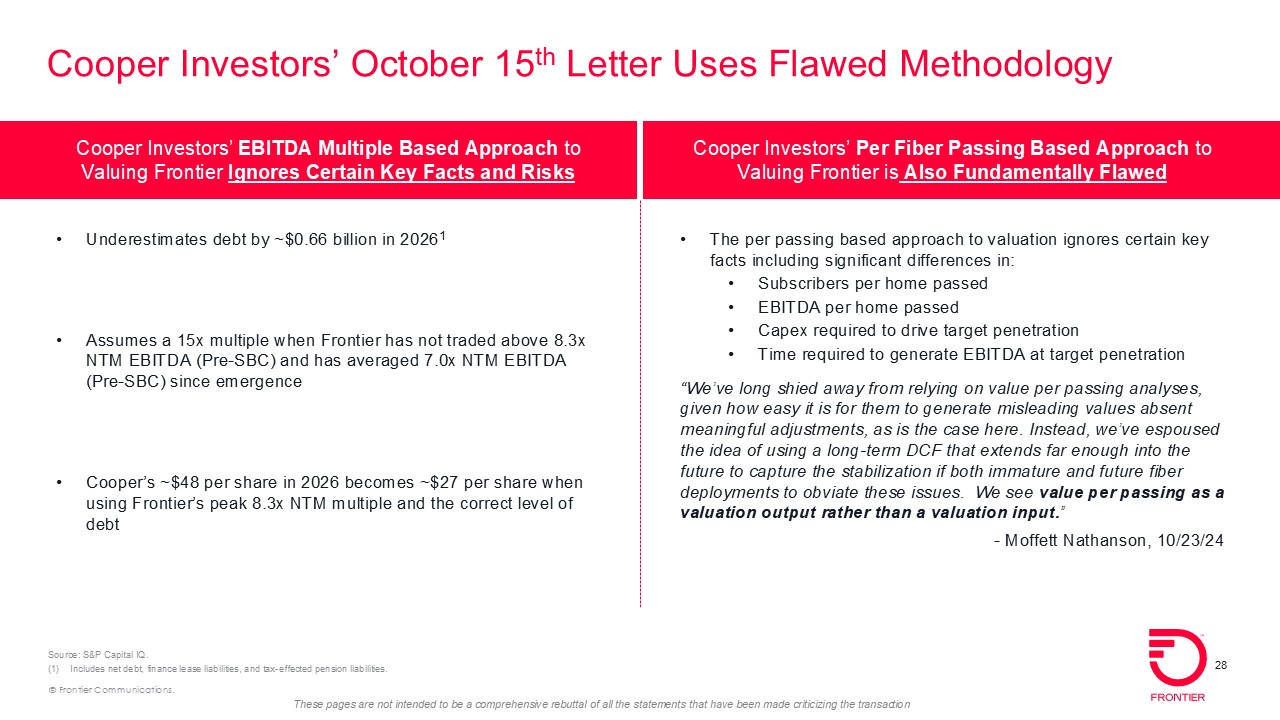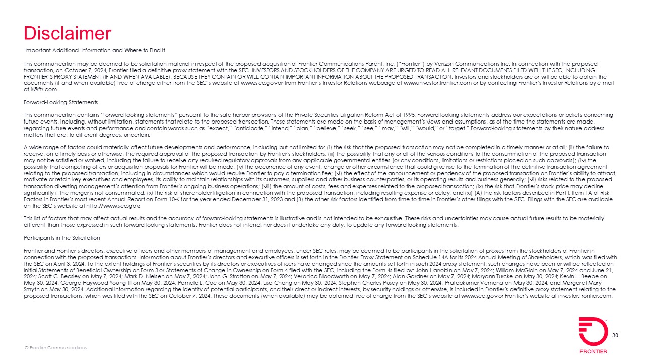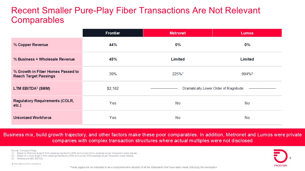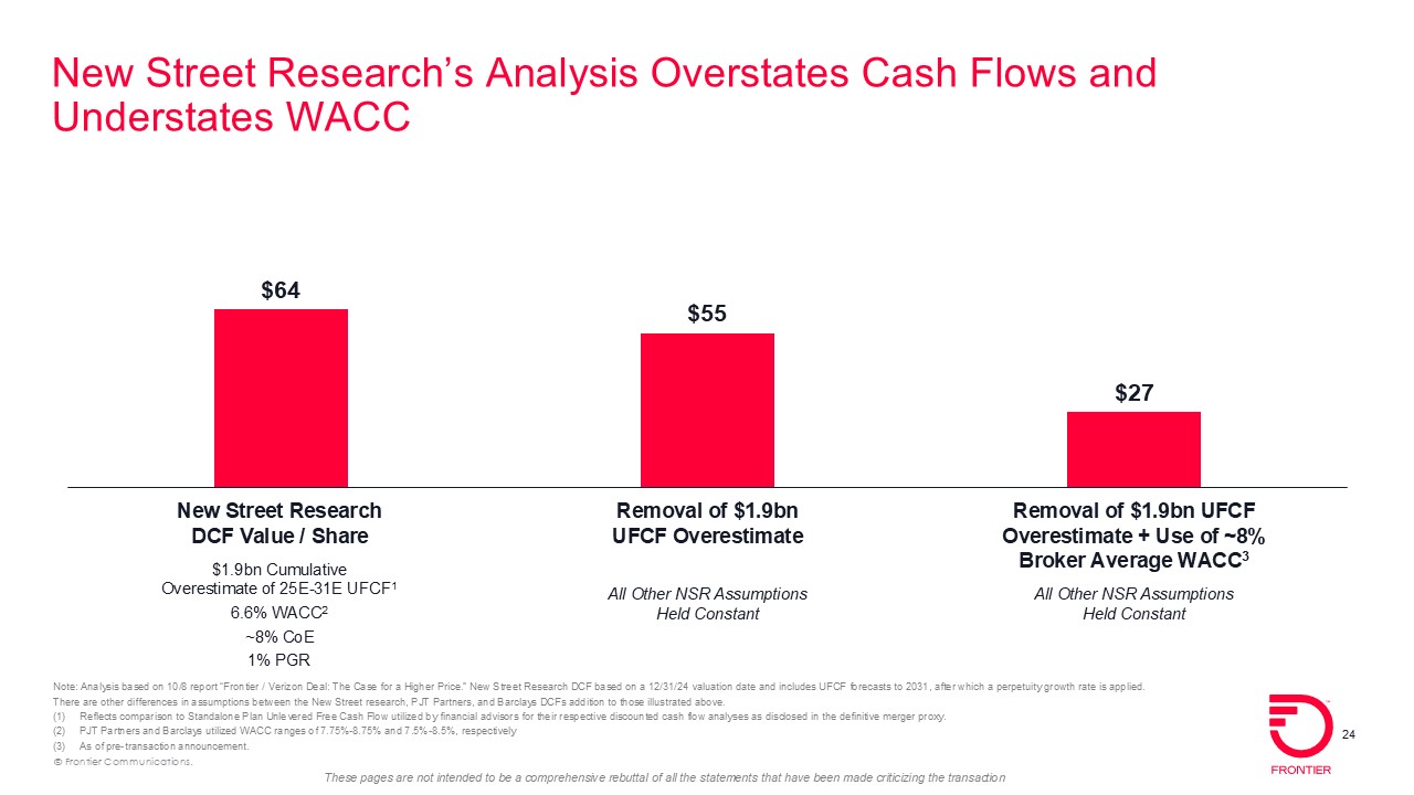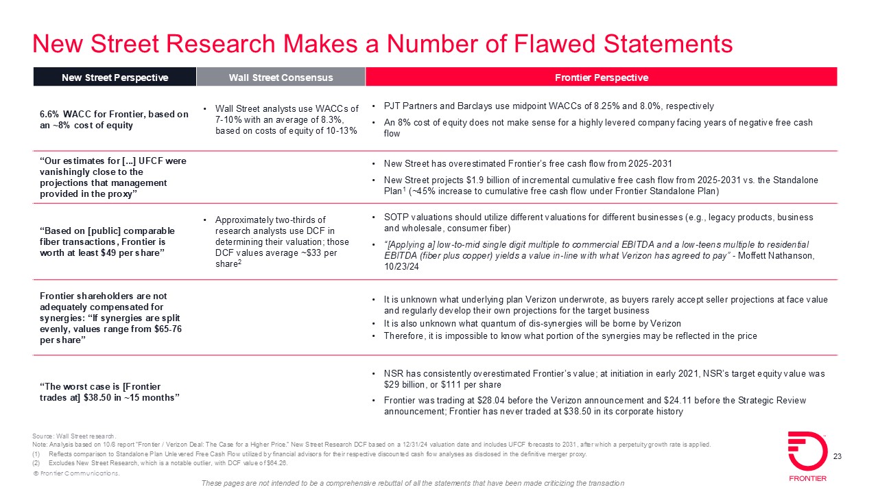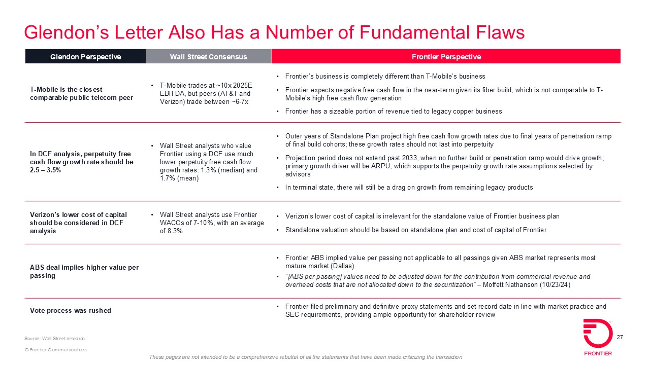 威瑞森通信提出的每股38.50美元的最佳和最终的全现金报价极具吸引力,并为股东创造了可观的价值,这反映出该公司较Frontier公告前的价格有37%的溢价,也较Frontier历史股票表现的所有其他衡量标准有显着溢价。