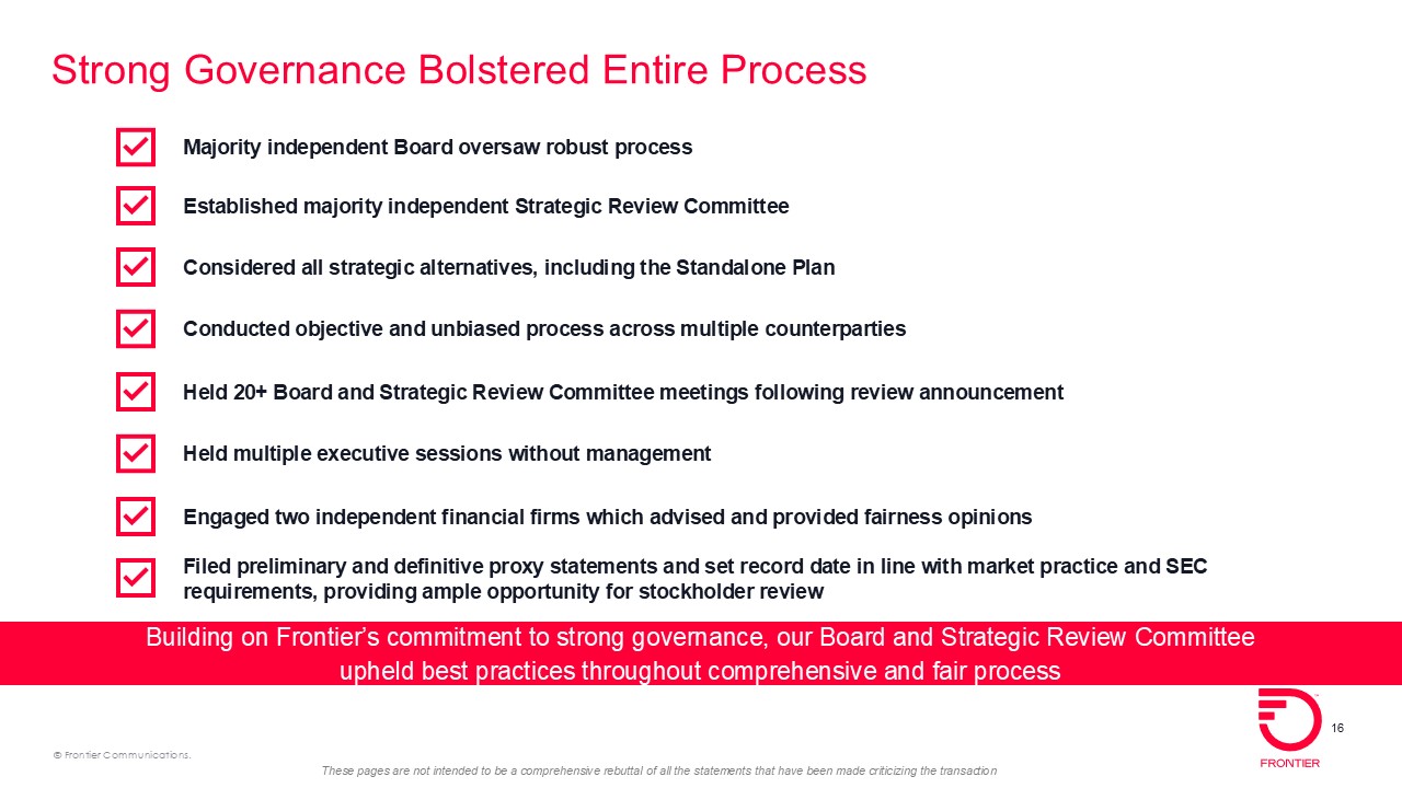 Frontier高素质的战略审查委员会和董事会领导了一个健全和详尽的流程,以评估其独立计划和战略选择。