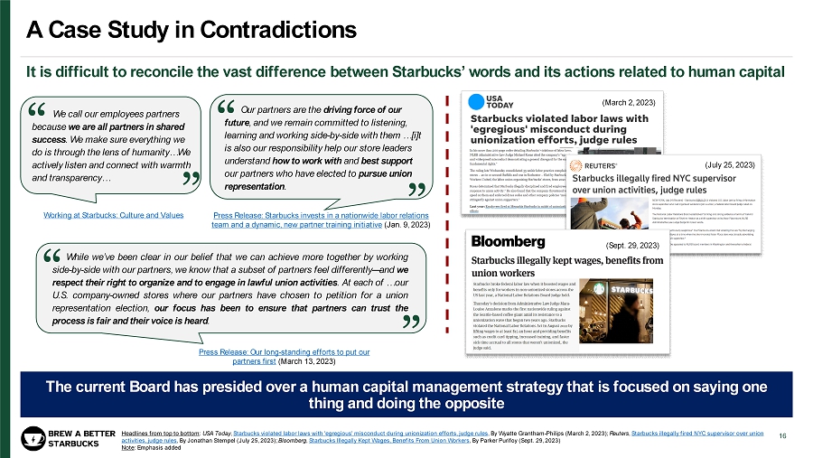 该公司对SOC提名的回应主要是一场公关活动,而不是对其劳工做法进行实质性改变•自从表明我们打算提名董事候选人以来,该公司发起了一场被动的公关活动,吹捧其声称致力于改善与员工的关系•董事会针对SOC提名董事候选人采取了一系列防御措施:»组建新的董事会委员会,重点关注“对利益相关者承诺的监督”»致工人联合会寻求重新参与谈判的公开信函»将董事会扩大三名,董事缺乏相关劳动法或员工关系方面的专业知识»几封致股东的公开信函»广泛评论首次在公司第一季度财报电话会议上发布15我们认为,这种程度的回应代表了对需要改变的明确承认,但最终重要的是现任董事的行动,而不是他们的话董事会的被动努力缺乏实质性
