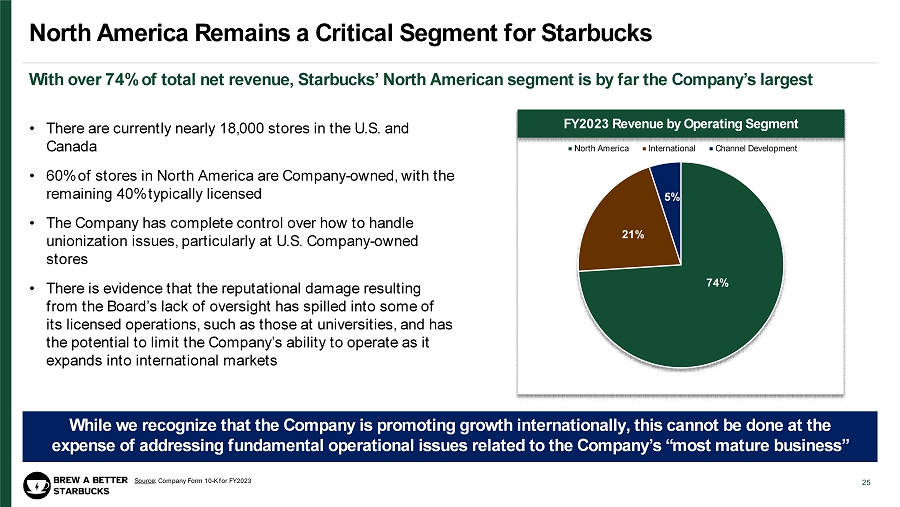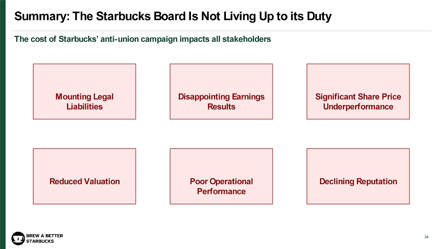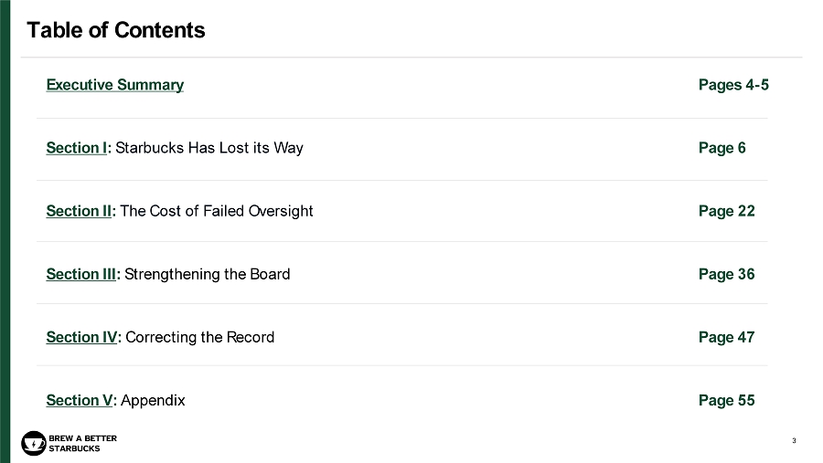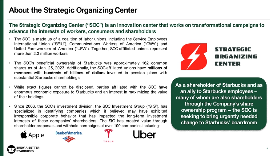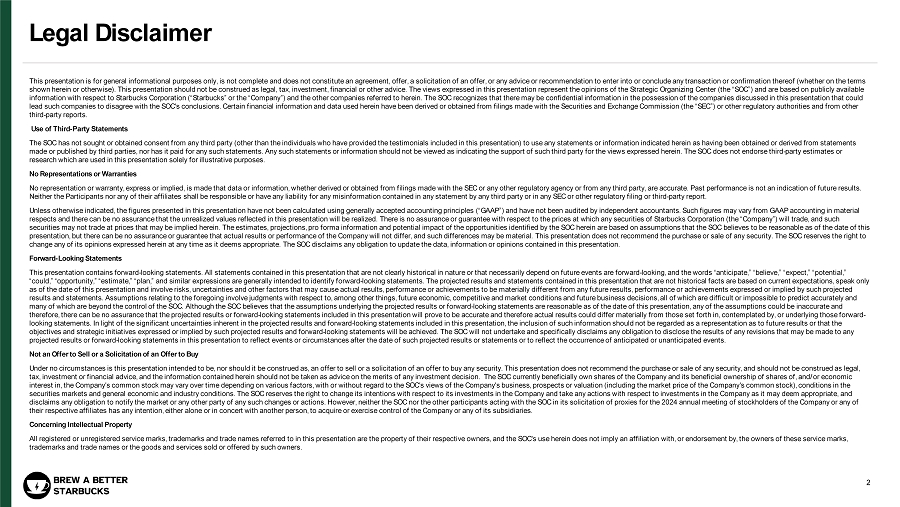 法律免责声明本演示文稿仅供一般参考之用,并不完整,不构成协议、要约、要约的sol邀请,或任何建议或建议,以达成或完成任何交易或确认交易(whe the r on the terms shown here or other)。此演示不应被解释为法律、税务、投资、财务或其他建议。本演示文稿中表达的观点代表战略组织中心(“SOC”)的意见,并基于p ubl icly可获得的有关星巴克公司(“星巴克”或“公司”)和此处提及的其他公司的信息。SOC认识到,本演示文稿中讨论的公司可能拥有机密信息,这可能会导致这些公司不同意SOC的结论。本文使用的某些财务信息和数据是从向美国证券交易委员会(“SEC”)或其他监管机构提交的文件以及其他第三方报告中衍生或获得的。使用第三方声明SOC没有寻求或获得任何第三方(除了提供本演示文稿中包含的证明的个人)的同意,以使用此处指明的任何声明或信息,因为这些声明或信息是从第三方作出或发表的陈述中获得或得出的,也没有为任何此类声明付费。任何此类声明或信息不应被视为表明此类第三方对此处表达的观点的支持。SOC不认可本演示文稿中仅用于说明目的的第三方估计或研究。没有任何陈述或保证没有作出任何明示或暗示的陈述或保证,即数据或信息,无论是从向SEC或任何其他监管机构或任何第三方提交的文件中得出或获得的数据或信息,都是准确的。过去的表现并不表示未来的结果。参与者或其任何关联机构均不对任何第三方的任何声明或任何SEC或其他监管文件或第三方报告中包含的任何错误信息负责或承担任何责任。除非另有说明,本演示文稿中的数字未使用公认会计原则(“GAAP”)进行计算,也未经独立会计师审计。这些数字可能与M AT里亚尔方面的GAAP会计有所不同,因此无法保证本演示文稿中反映的未实现价值将会实现。对于星巴克公司(“公司”)的任何证券将交易的价格,没有任何保证或保证,并且d此类证券可能不会以此处可能暗示的价格交易。此处SOC确定的机会的估计、预测、备考信息和潜力l i mpact是基于SOC认为截至本演示文稿日期合理的假设,但无法保证或保证公司的实际结果或业绩不会存在差异,且此类差异可能是重大的。本演示文稿不建议购买或出售任何证券。SOC保留在其认为适当时随时更改其在此表达的任何意见的权利。SOC不承担更新本演示文稿中包含的数据、信息或意见的任何义务。前瞻性陈述本演示文稿包含前瞻性陈述。本演示文稿中包含的所有在性质上不明显是历史性的或必然取决于未来事件的陈述都是前瞻性的,“预期”、“相信”、“预期”、“潜在”、“可能”、“机会”、“估计”、“计划”和类似表述通常旨在识别前瞻性陈述。本演示文稿中包含的非历史事实的预计结果和陈述基于当前的exp ect ations,仅在本演示文稿发布之日发表并涉及可能导致实际结果、执行ANC e或成就与SUC H P rojected结果和陈述明示或暗示的任何未来结果、业绩或成就存在重大差异的风险、不确定性和其他因素。与上述相关的假设涉及对(其中包括)未来电子商务、竞争和市场条件以及未来商业决策的判断,所有这些都很难或不可能预测交流协议,其中许多超出了SOC的控制范围。尽管SOC认为,截至本演示文稿发布之日,预测的resu lts或前瞻性陈述所依据的假设是合理的,但任何假设都可能是不准确的,因此, 无法保证本演示文稿中包含的预计结果或前瞻性陈述将被证明是准确的,因此实际结果可能与这些前瞻性陈述中所述、所设想的或基础上的陈述存在重大差异。鉴于本演示文稿中包含的预计结果和前瞻性陈述中固有的重大不确定性,不应将包含此类信息视为对未来resul ts的表示,也不应将此类预计结果和前瞻性陈述所表达或暗示的目标和战略举措视为将实现。SOC将不承担并明确表示不承担任何义务披露本演示文稿中任何预测结果或前瞻性陈述可能发生的任何修订的结果,以反映此类p rojected结果或陈述日期之后的事件或情况,或反映预期或意外事件的发生。不是出售要约或购买要约的招揽在任何情况下,本演示文稿均无意成为,也不应被解释为出售要约或购买任何证券的要约招揽。本演示文稿不建议购买或出售任何证券,不应被视为法律、税务、投资或财务建议,此处包含的信息不应被视为对任何投资评估决定的优点的建议。SOC目前实益拥有公司的股份及其对公司普通股的股份的实益所有权和/或EConomic权益可能会随着时间的推移而变化,具体取决于各种因素,无论SOC对公司业务、前景或估值(包括公司普通股的市场价格)、证券市场的条件以及一般经济和行业状况。SOC保留改变其与respec t对其在公司的投资的意向的权利,并就其认为适当的对公司的投资采取任何行动,并且不承担将任何此类变化或行动通知市场或任何其他方的任何义务。然而,SOC或与SOC一起在其为Co mpa ny或其任何关联公司的2024年年度股东大会征集代理中行事的其他参与者均无意单独或与另一人一致收购或行使对公司或其任何子公司的控制权。关于知识产权本演示文稿中提及的所有已注册或未注册的服务标记、商标和商号均为EIR各自所有者的财产,SOC在此的使用并不意味着与这些SE rvi ce标记、商标和商号的所有者或这些所有者销售或提供的商品和服务的从属关系或背书。2