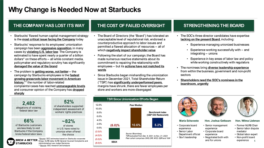 关于战略组织中心• SOC由工会联盟组成,包括服务雇员国际工会(“SEIU”)、美国通信工人协会(“CWA”)和美国农场工人联合会(“UFW”)。SOC-附属工会加起来代表了2个以上。300万工人•截至2023年1月25日,SOC对星巴克的实益所有权约为162股普通股。此外,SOC附属工会有数百万成员,数千亿美元投资于星巴克大量持股的养老金计划•虽然无法披露确切数字,但SOC附属各方对星巴克拥有巨大的经济敞口,并有兴趣实现其所持股份价值的最大化•自2006年以来,SOC的投资部门SOC Investment Group(“SIG”)专门识别其认为可能表现出不负责任的公司行为的公司,这些行为影响了这些公司股东的长期投资利益。SIG通过股东提案创造了价值,并在100多家公司开展了截留活动,其中包括:作为星巴克的股东和星巴克员工的盟友——其中许多人还通过公司的股份所有权计划成为股东—— SOC正在寻求为星巴克的董事会带来迫切需要的变革。战略组织中心(“SOC”)是一个创新中心,致力于推动员工、消费者和股东的利益的转型活动4