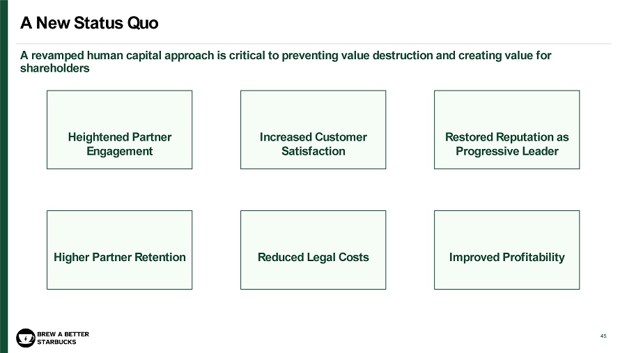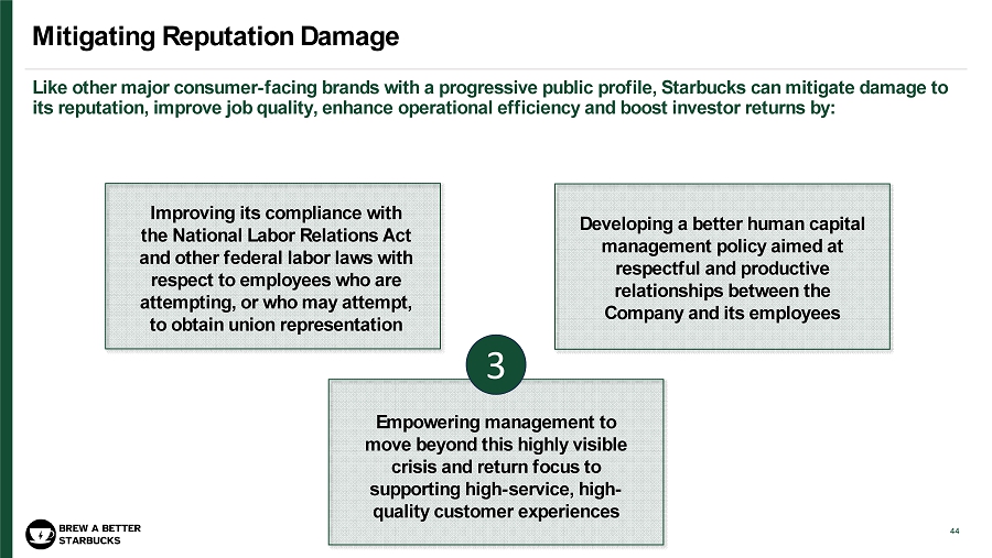 与其他具有进步公众形象的面向消费者的主要品牌一样,星巴克可以通过以下方式减轻对其声誉的损害、提高工作质量、提高运营效率并提高投资者回报:44减轻声誉损害改善其对《国家劳动关系法》和其他联邦劳动法的遵守情况,这些员工正试图或可能试图获得工会代表,制定更好的人力资本管理政策,旨在公司与员工之间建立尊重和富有成效的关系,从而使管理层能够超越这一高度可见的危机,并将重点重新放在支持高服务上,高质量的客户体验3