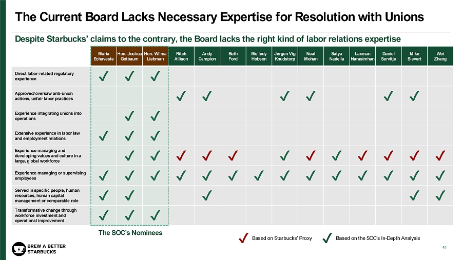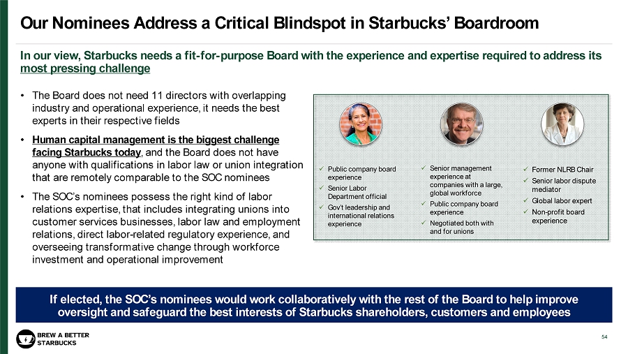 认为SOC的提名人拥有当前董事会所缺乏的专业知识和急需的技能组合,以帮助解决公司在劳工问题上的破碎方法,恢复其品牌并最大限度地提高股东价值