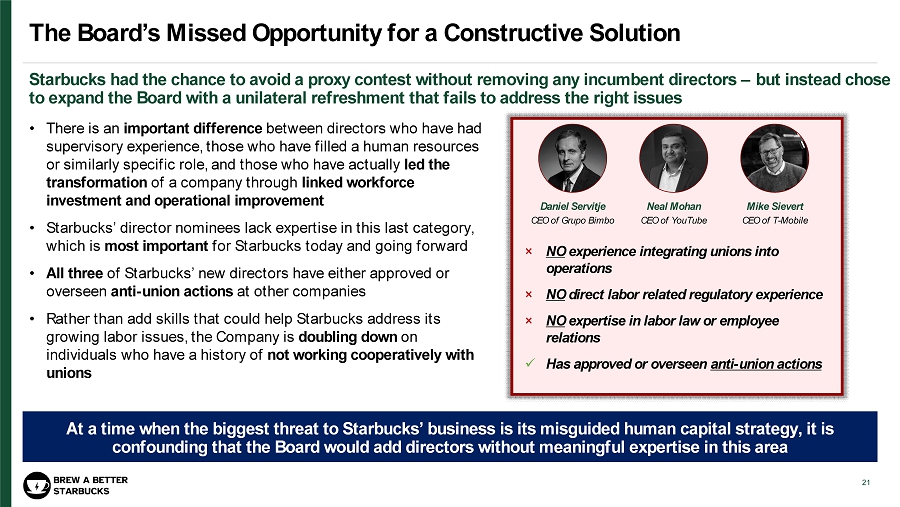 •具有监管经验的董事、担任过人力资源或类似特定角色的董事,与通过员工队伍投资和运营改善相关联而实际领导公司转型的董事之间存在重要区别•星巴克的董事提名人选缺乏最后一个类别的专业知识,这对星巴克今天和未来都是最重要的•星巴克的三位新董事要么批准了,要么监督了其他公司的反工会行动•而不是增加可以帮助星巴克解决其日益严重的劳工问题的技能,该公司正在加倍打击那些有过不与工会合作历史的个人,21在星巴克业务面临的最大威胁是其被误导的人力资本战略之际,令人困惑的是,董事会将在该领域没有有意义的专业知识的情况下增加董事。董事会错过了建设性解决方案的机会,星巴克本有机会在不罢免任何现任董事的情况下避免代理权竞争——而是选择以单方面的刷新来扩大董事会未能解决正确问题的Daniel Servitje Grupo Bimbo首席执行官Neal Mohan YouTube首席执行官Mike Sievert T-Mobile首席执行官×没有将工会融入运营的经验×没有直接的劳工相关监管经验×没有劳动法或员工关系方面的专业知识x是否已批准或监督反工会行动