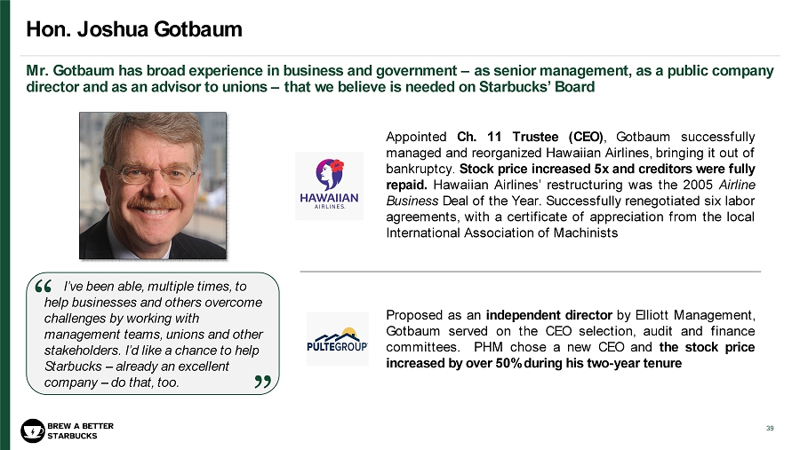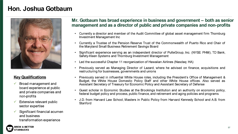 Hon. Joshua Gotbaum 39 Gotbaum先生在商业和政府方面拥有广泛的经验——作为高级管理层、上市公司董事和工会顾问——我们认为这是星巴克董事会任命的第11任受托人(首席执行官)所需要的,Gotbaum成功地管理和重组了夏威夷航空,使其摆脱了破产困境。股价上涨5倍,债权人获得全额偿付。夏威夷航空的重组是2005年年度航空公司业务交易。成功重新谈判六份劳资协议,获得当地国际机械师协会的感谢证书由Elliott Management提议担任独立董事,Gotbaum曾在CEO遴选、审计和财务委员会任职。PHM选择了新的CEO,两年任期内股价涨幅超50%“”我已经多次通过与管理团队、工会和其他利益相关者合作,帮助企业和其他人克服挑战。我希望有机会帮助星巴克——已经是一家优秀的公司——也做到这一点。