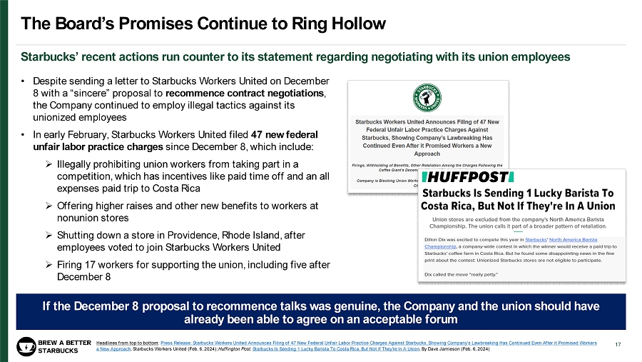 17如果12月8日重启谈判的提议是真实的,公司和工会应该已经能够就一个可以接受的论坛达成一致董事会的承诺继续让Hollow星巴克感到振奋星巴克最近的行动与其关于与工会员工进行谈判的声明背道而驰•尽管12月8日向星巴克工人联合会发送了一封信,其中提出了重新开始合同谈判的“真诚”提议,但该公司继续对其加入工会的员工采用非法策略• 2月初,星巴克工人联合会自12月8日以来提出了47项新的联邦不公平劳工行为指控,其中包括:»非法禁止工会工人参加竞赛,该竞赛有带薪休假和前往哥斯达黎加的所有费用带薪旅行等激励措施»向非工会商店的工人提供更高的加薪和其他新福利»在员工投票加入星巴克工人联合会后,关闭了罗德岛州普罗维登斯的一家商店»解雇17名支持工会的工人,其中5名是12月8日后自上而下的头条新闻:新闻稿:星巴克工人联合会宣布对星巴克提出47项新的联邦不公平劳工行为指控,显示公司的违法行为仍在继续,即使在它向工人承诺了一种新方法之后,星巴克工人联合会(2024年2月6日);赫芬顿邮报,星巴克正在向哥斯达黎加派出1名幸运的咖啡师,但如果他们在工会,就不会,作者:Dave Jamieson(2024年2月6日)