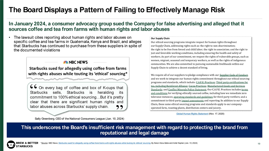 •该诉讼援引了关于危地马拉、肯尼亚和巴西特定咖啡和茶农场存在人权和劳工侵权行为的报道,并声称尽管2024年1月存在记录在案的违规行为,星巴克仍继续从这些供应商处采购,一个消费者权益保护组织起诉该公司虚假广告,并声称其从存在人权和劳工侵权行为的农场采购咖啡和茶19这凸显了董事会在保护品牌免受声誉和法律损害方面的风险管理不足。董事会显示出未能有效管理星巴克销售的每一袋咖啡和一盒K杯的风险的模式,星巴克正在宣告其对100%道德采购的承诺……但很明显,星巴克供应链中存在严重的人权和劳工侵权行为。“”全国消费者联盟首席执行官萨利·格林伯格(2024年1月10日)星巴克因涉嫌在吹捧其‘道德’采购的同时使用来自存在权利滥用的农场的咖啡而被起诉*全球人权声明(2020年11月17日)*来源:NBC新闻,星巴克因涉嫌在吹捧其‘道德’采购的同时使用来自存在权利滥用的农场的咖啡而被起诉,由Kenzi Abou-Sabe和Adiel Kaplan(2024年1月10日)