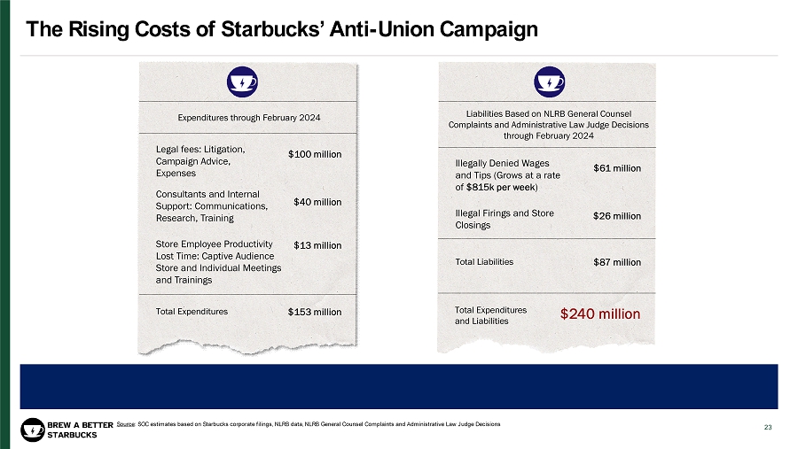 23截至2024年2月星巴克反工会活动支出成本上升法律费用:诉讼、竞选建议、费用顾问和内部支持:沟通、研究、培训门店员工生产力损失时间:专属观众门店和个人会议和培训1亿美元4000万美元1300万美元总支出1.53亿美元负债基于截至2024年2月的NLRB总法律顾问投诉和行政法法官裁决非法拒绝的工资和小费(以每周81.5万美元的速度增长)非法解雇和关闭门店6100万美元2600万美元总负债8700万美元总支出和负债2.4亿美元资料来源:SOC根据星巴克公司文件、NLRB数据、NLRB总法律顾问投诉和行政法法官De CISions估算
