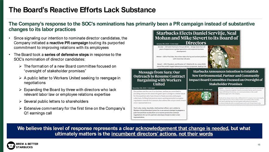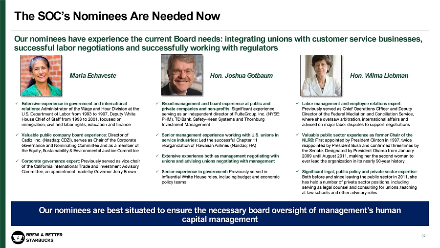 SOC表示:“星巴克是一家迷失方向的标志性公司。现任董事会(“董事会”)容忍了令人无法接受的声誉风险水平,支持对劳资问题采取适得其反的做法,并允许存在缺陷的资源分配——所有这些都对股东价值产生了负面影响。这些问题正在恶化,而不是好转。我们认为,现在是做出改变的时候了,这就是为什么SOC提名了三位非常合格的人,他们带来了来自商业、政府和非营利部门的多元化领导经验,参加星巴克董事会的选举。最重要的是,这些被提名人拥有现任董事会极度缺乏的专业知识。我们鼓励股东帮助传递这样的信息,即是时候通过今天投票给我们的董事候选人来酿造更好的星巴克了。”