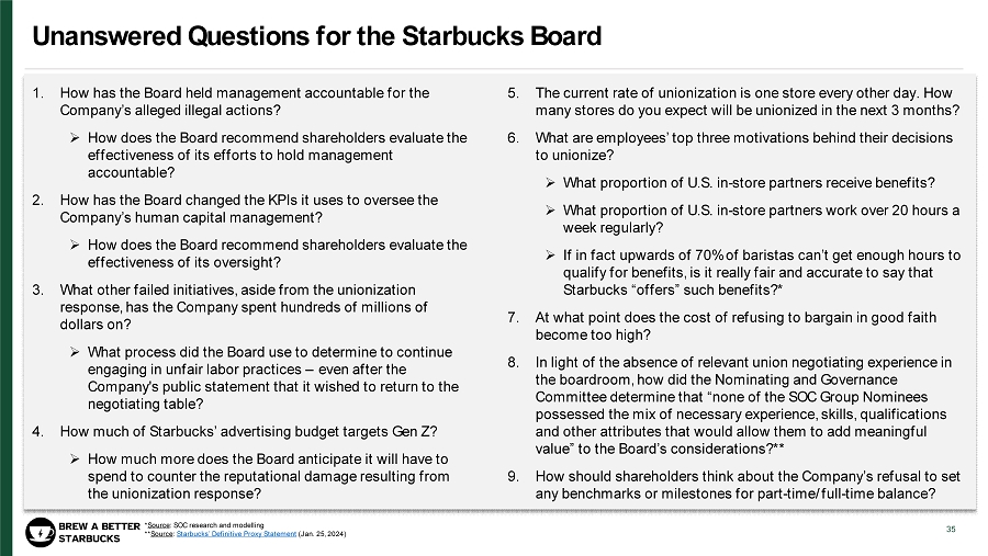 星巴克董事会未回答的问题1。董事会如何追究管理层对公司涉嫌违法行为的责任?»董事会建议股东如何评估其追究管理层责任的努力的有效性?2.董事会如何改变其用来监督公司人力资本管理的KPI?»董事会建议股东如何评估其监督的有效性?3.除了工会响应,公司还在哪些失败的举措上花费了数亿美元?»董事会使用了什么程序来确定继续从事不公平的劳工做法——即使在公司公开声明希望重返谈判桌之后也是如此?4.星巴克的广告预算有多少针对Z世代?»董事会预计还需要花费多少资金来应对因工会反应而造成的声誉损失?35 *来源:SOC Research and Modeling * *来源:星巴克的最终代理声明(2024年1月25日)5。目前的工会化速度是每隔一天就有一家店。您预计未来3个月会有多少门店加入工会?6.员工决定加入工会背后的三大动机是什么?»美国店内合作伙伴领取福利的比例有多大?»美国店内合伙人每周定时工作时间超过20小时的比例有多大?»如果事实上超过70%的咖啡师无法获得足够的工作时间来享受福利,那么说星巴克“提供”这样的福利真的公平准确吗?* 7。拒绝善意讨价还价的代价在什么时候变得过高?8.鉴于董事会会议室缺乏相关工会谈判经验,提名和治理委员会如何确定“SOC集团被提名人中没有一人具备必要的经验、技能、资格和其他属性的组合,这将使他们能够为董事会的考虑增加有意义的价值”?* * 9。对于公司拒绝为兼职/全职平衡设定任何基准或里程碑,股东应该如何看待?