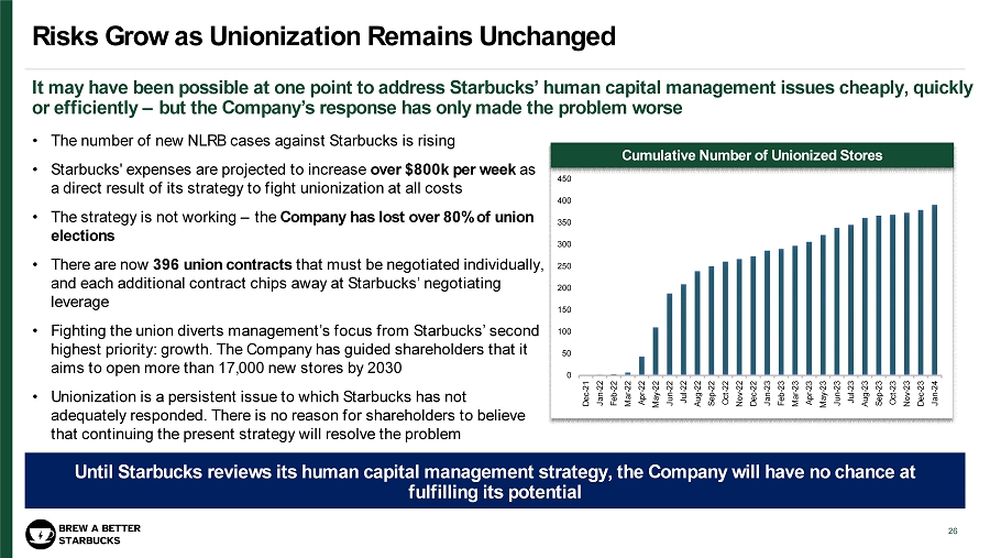 7董事会的反工会战略导致了美国现代史上最明显和最具破坏性的人力资本管理不善的例子之一星巴克处理劳工问题的方法被打破133 NLRB投诉星巴克是NLRB自2021年12月以来提出的所有禁令中的三分之一的目标,自2021年12月以来,星巴克员工平均每两天选择在一家新店加入工会,约9000名加入工会的员工396家门店的个人合同有待谈判——而且这个数字从左到右都在增长头条新闻:Axios,星巴克被控因工会组织问题非法关闭门店,丽贝卡·法尔科纳(Rebecca Falconer)(2023年12月14日);彭博法律,随着裁决的推出,星巴克正在积累违反劳动法的行为,罗伯特·亚福拉和帕克·普里福伊(2023年6月2日);美国有线电视新闻网,法官:星巴克违反联邦劳动法,拒绝向加入工会的工人加薪,丹妮尔·维纳-布朗纳(Danielle Wiener-Bronner)(2023年9月29日);纽约时报,法官禁止星巴克解雇工会支持者,诺姆·舍伯(Noam Scheiber)(2月22日,2023年);财联社,工党法官:星巴克在工会斗争中侵犯了工人权利,作者:Dee-Ann Durbin(2023年3月2日)工党法官:星巴克在42个州和华盛顿特区的工会斗争中侵犯了工人权利。