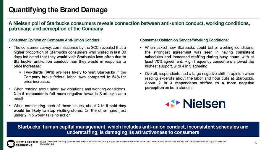 来源:Custom Nielsen Study,202年1月5日SOC委托支付4。该调查于2024年1月12日至18日在线上进行,包括来自美国所有50个州和华盛顿特区的20002名受访者。尼尔森对星巴克消费者进行的一项民意调查显示,反工会行为、工作条件、赞助和对公司的看法之间存在联系32星巴克的人力资本管理,其中包括反工会行为、不一致的日程安排和人手不足,正在损害其对消费者的吸引力。量化品牌损害消费者对公司反工会行为的意见:•消费者调查,受SOC委托,透露,在过去30天内到访的星巴克消费者中,表示由于星巴克的反工会行为,他们去星巴克的次数比回应涨价时要少的比例更高:»三分之二(66%)的人不太可能去星巴克,如果公司违反了联邦劳动法,而涨价的人只有54% •在阅读有关违反劳动法和工作条件的内容时,五分之三的受访者因此对星巴克感到更负面•在考虑这些问题时,大约五分之二的人表示,他们很可能会停止逛商店。另一方面,略低于五分之二的人不会采取行动消费者对服务/工作条件的意见:•当被问及星巴克如何改善工作条件时,最强烈的一致意见是在繁忙时间有一致的日程安排和增加人员,至少有70%的同意。高频消费者的支持率最高,五分之四的人表示同意•总体而言,受访者在阅读有关星巴克人工和工时削减的摘录时,观点发生了很大的负面转变。大约三分之二的受访者对这两种立场都转向了更负面的看法