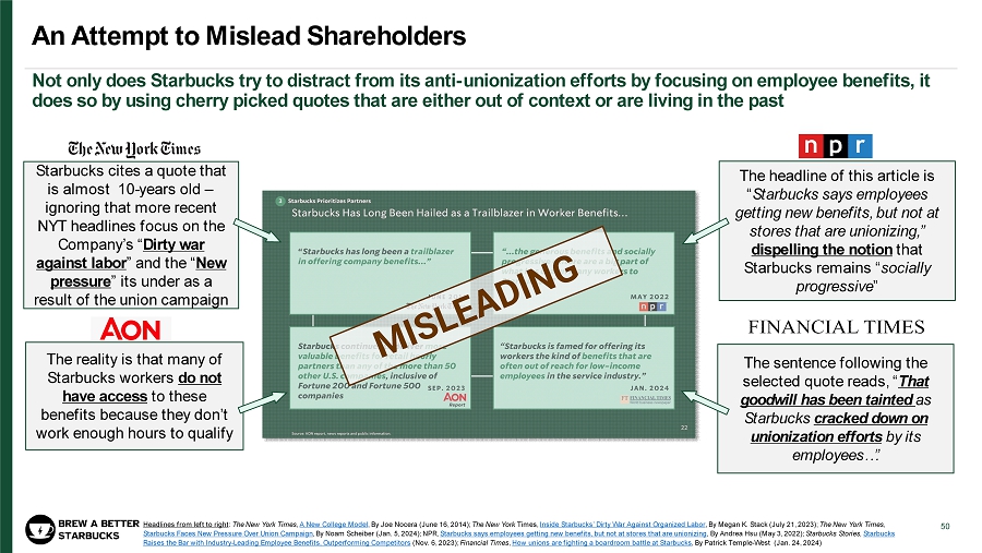 这篇文章的标题是“星巴克称员工获得新福利,但不是在正在加入工会的商店,”打消星巴克保持“社会进步”的观念,星巴克不仅试图通过关注员工福利来分散其反工会努力的注意力,它还通过使用樱桃采摘的语录来做到这一点,这些语录要么断章取义,要么活在过去的50年里,试图误导股东,所选语录后面的句子是这样写的,“随着星巴克打击员工加入工会的努力,这种善意受到了玷污……”现实情况是,许多星巴克员工无法获得这些福利,因为他们没有足够的工作时间来获得资格。星巴克引用了一句几乎有10年历史的名言——忽略了最近《纽约时报》的头条新闻聚焦于该公司“与劳工的肮脏战争”以及工会运动导致其承受的“新压力”。头条新闻从左到右依次为:新的大学模式《纽约时报》,作者:乔·诺塞拉(Joe Nocera)(2014年6月16日);《纽约时报,Inside Starbucks ' Dirty War Against Organized Labor》,作者:Megan K. Stack(2023年7月21日);《纽约时报》,星巴克在工会运动方面面临新的压力,作者:Noam Scheiber(2024年1月5日);NPR,星巴克称员工获得了新的福利,但不是在正在成立工会的商店,作者:Andrea Hsu(2022年5月3日);星巴克故事,星巴克以行业领先的员工福利提高标准,表现优于竞争对手(2023年11月6日);金融时报,工会如何在星巴克打一场董事会之战,帕特里克·坦普尔-韦斯特(2024年1月24日)