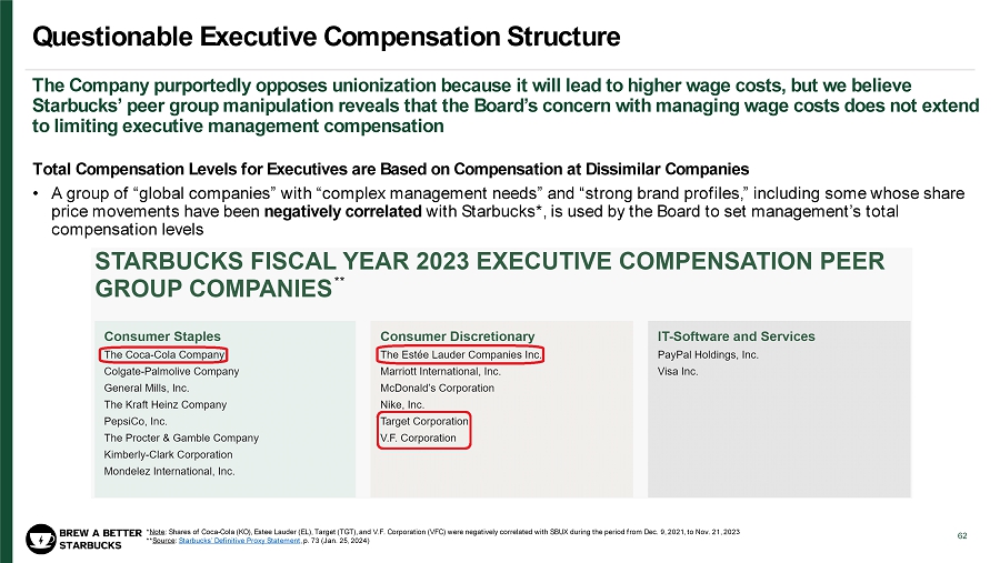 高管总薪酬水平基于不同公司的薪酬•一批“管理需求复杂”、“品牌形象强”的“全球公司”,包括一些其股价走势一直与星巴克呈负相关的*,被董事会用来设定管理层的总薪酬水平存在疑问的高管薪酬Structure 62该公司据称反对工会化,因为这会导致更高的工资成本,但我们认为星巴克的同行集团操纵揭示了董事会对管理工资成本的关注并未延伸到限制高管管理层的薪酬*注:可口可乐(KO)、雅诗兰黛(EL)、塔吉特(TGT)和V.F. Corporation(VFC)的股票在2021年12月9日起的这段时间内与SBUX呈负相关,至2023年11月21日* *来源:星巴克的最终代理声明,第73页(2024年1月25日)* *