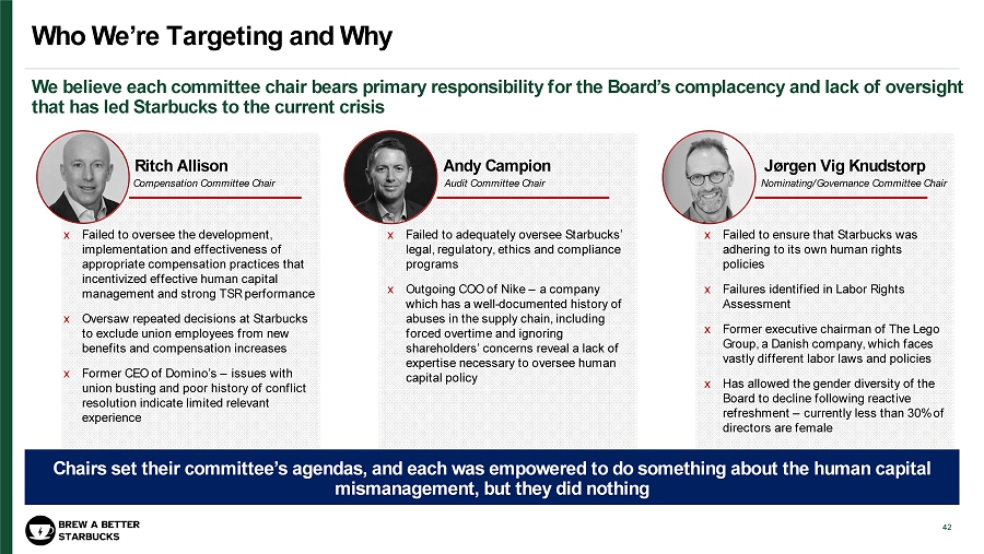 42位主席制定了他们委员会的议程,每个人都被授权对人力资本管理不善做点什么,但他们什么也没做,我们的目标是谁,为什么Ritch Allison x未能监督发展,激励有效的人力资本管理和强劲的TSR表现的适当薪酬做法的实施和有效性x监督了星巴克一再做出的将工会员工排除在新福利和薪酬增加之外的决定x达美乐前首席执行官–工会破产问题和冲突解决的糟糕历史表明相关经验有限Andy Campion Jørgen Vig Knudstorp我们认为,每位委员会主席都对董事会的自满和缺乏监督负有主要责任,这导致星巴克成为目前的危机薪酬委员会主席审计委员会主席提名/治理委员会主席x未能充分监督星巴克的法律、监管、道德和合规项目x耐克即将离任的首席运营官——这家公司在供应链中存在着有据可查的滥用历史,包括被迫加班和无视股东的担忧,这表明缺乏监督人力资本政策所必需的专业知识x未能确保星巴克遵守自己的人权政策x劳工权利评估中发现的失败x丹麦公司乐高集团前执行董事长,面临截然不同的劳动法和政策x让董事会的性别多样性在被动刷新后下降——目前不到30%的董事是女性