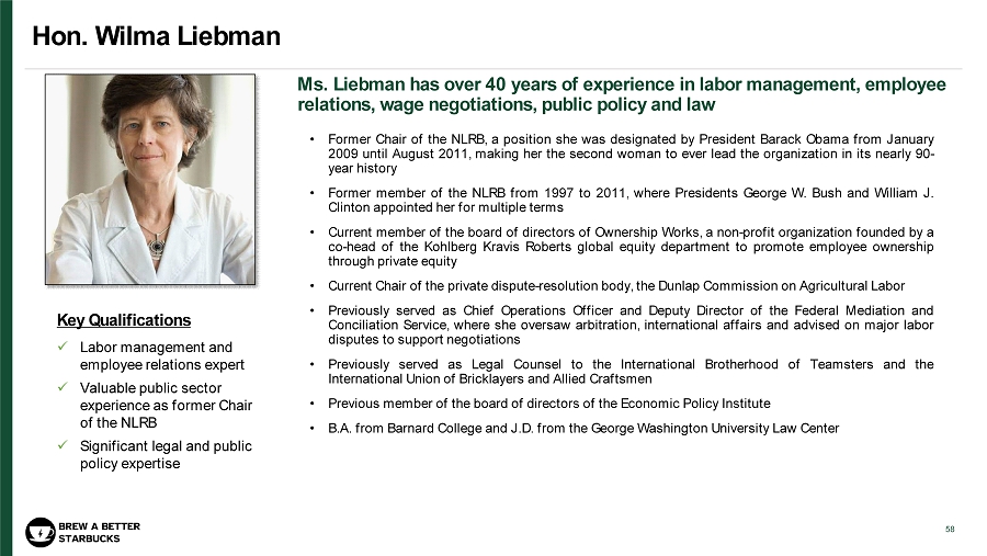 Hon. Wilma Liebman 40 Liebman女士在劳资管理、员工关系、工资谈判、公共政策和法律方面拥有超过40年的经验,我们认为这些经验将为星巴克董事会带来至关重要的经验。提供的战略建议有助于解决困难的集体谈判纠纷,其中一些涉及激烈的罢工(例如。、UPS、卡特彼勒、波音)。利布曼支持该机构主管在Kaiser Permanente与其众多工会之间发起历史性的劳工管理伙伴关系,这种伙伴关系产生于数十年来不断加剧的不满和罢工,这些不满和罢工有可能使该组织脱轨并损害其作为NLRB主席提供优质护理的能力,利布曼成功地度过了自20世纪40年代以来从未见过的不断升级的政治风暴,包括激进的国会监督以及对该机构预算和存在的生存威胁。与此同时,她管理内部政治,监督该机构的案卷和决策,并展示该组织的积极公众愿景“”总的来说,我的经验和与商界和劳工界的关系让我对可能威胁组织并危及其声誉和生存能力的工作场所冲突的原因和动态有了独特的、多维度的视角和理解,以及以建设性方式解决和疏导冲突的途径。
