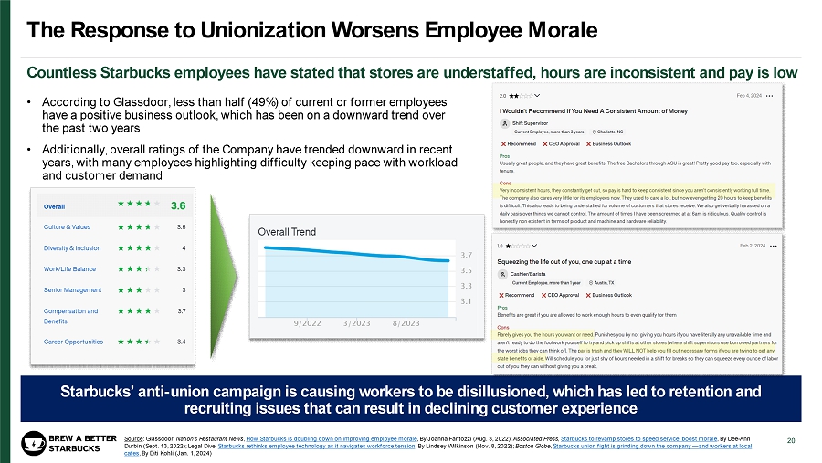• Glassdoor称,不到一半(49%)的现任或前任员工对业务前景持积极态度,过去两年一直呈下降趋势•此外,近年来公司的整体评级呈下降趋势,许多员工强调难以跟上工作量和顾客需求无数星巴克员工表示,门店人手不足、工时不一致且工资低20星巴克的反工会运动正在导致员工的幻想破灭,这导致了留用和招聘问题,可能导致客户体验下降对工会化的反应恶化了员工士气来源:Glassdoor;Nation’s Restaurant News,星巴克如何加倍努力提高员工士气,作者:Joanna Fantozzi(2022年8月3日);美联社,星巴克将改造门店以加快服务速度,提振士气,作者:Dee-Ann Durbin(2022年9月13日);法律潜水,星巴克在应对劳动力紧张时重新思考员工技术,作者:Lindsey Wilkinson(2022年11月8日);波士顿环球报,星巴克工会斗争正在磨灭这家公司——以及当地咖啡馆的工人,作者:Diti Kohli(2024年1月1日)