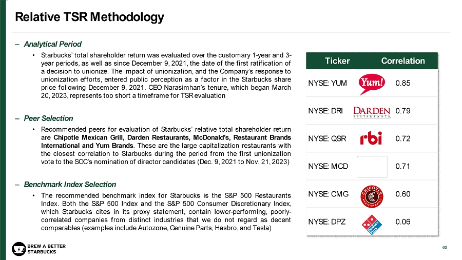 相对TSR方法60 –分析期•星巴克的股东总回报在惯常的1年和3年期间以及自2021年12月9日(即首次批准工会决定之日)以来进行了评估。工会化的影响,以及公司对工会化努力的回应,在2021年12月9日之后作为星巴克股价的一个因素进入公众认知。CEO Narasimhan的任期始于2023年3月20日,这代表着TSR评估的时间框架太短– Peer Selection •评估星巴克相对股东总回报的推荐同行是奇波雷墨西哥烧烤、达登饭店、麦当劳、餐饮品牌国际国际和百胜餐饮集团。这些是从首次工会投票到SOC提名董事候选人期间(2021年12月9日至2023年11月21日)与星巴克相关性最密切的大市值餐厅–基准指数选择•星巴克推荐的基准指数为标普 500餐厅指数。星巴克在其代理声明中引用的标普 500指数和标普 500非必需消费品指数都包含来自不同行业的表现较差、相关性较差的公司,我们认为这些公司没有像样的可比性(例如AutoZone、通用配件、孩之宝和特斯拉)60相关股票代码0.85 NYSE:YUM 0.79 NYSE:DRI 0.72 NYSE:QSR 0.71 NYSE:MCD 0.60 NYSE:CMG 0.06 NYSE:DPZ无法显示图片。