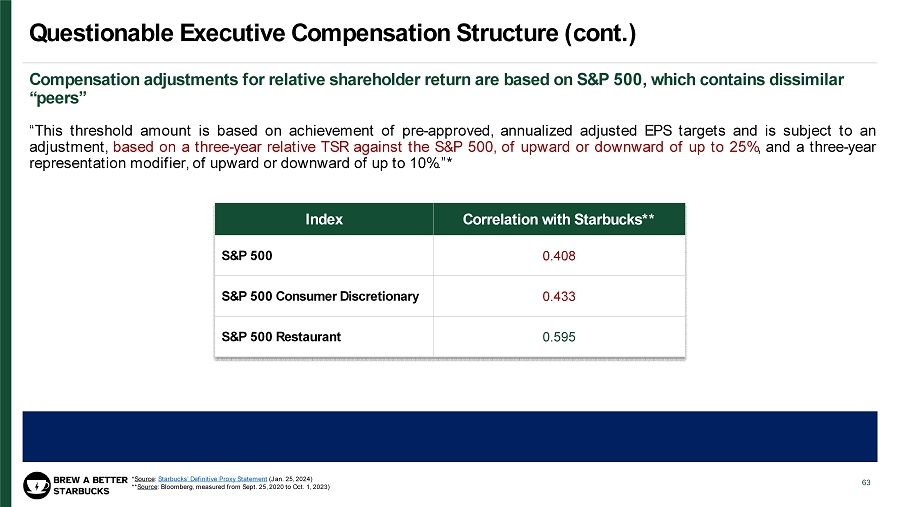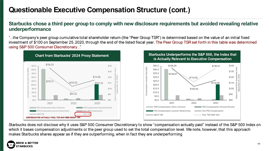 可疑的高管薪酬Structure(续)“这个门槛金额是基于预先批准的年化调整后每股收益目标的实现情况,并可能进行调整,基于与标普 500指数向上或向下最高25%的三年相对股东总回报,以及向上或向下最高10%的三年代表性修正值。”* 63与星巴克的相关性* *指数0.408 标普 5000.433 标普 500非必需消费品0.595 标普 500餐厅相对股东回报的薪酬调整基于TERM3 500,其中包含不同的“同行”*来源:星巴克最终委托书(2024年1月25日)* *来源:彭博,测量时间为2020年9月25日至2023年10月1日)