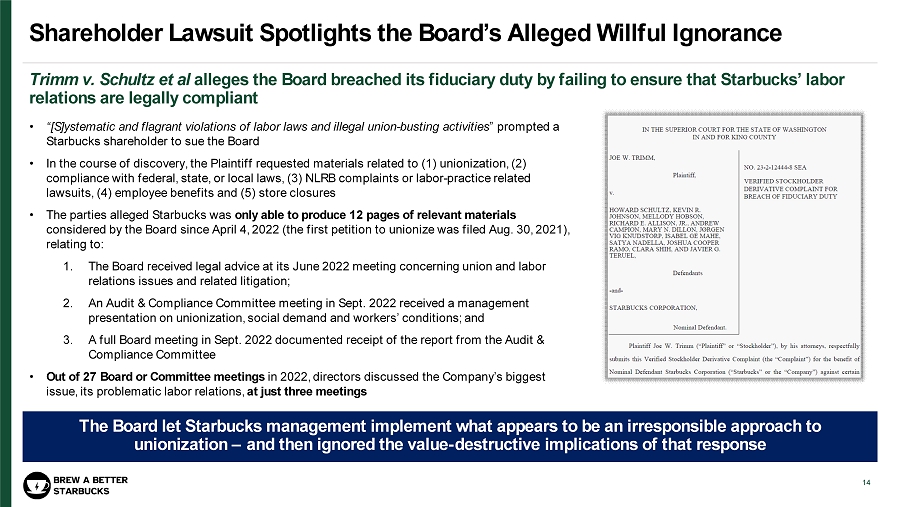 •“[ s ]系统性和公然违反劳动法和非法破坏工会活动”促使星巴克股东向董事会提起诉讼•在发现过程中,原告要求提供与(1)加入工会、(2)遵守联邦、州或地方法律、(3)NLRB投诉或与劳工实践相关的诉讼、(4)员工福利和(5)门店关闭相关的材料•当事人称,自2022年4月4日以来,星巴克仅能出示董事会审议的12页相关材料(第一次加入工会的请愿书于2021年8月30日提交),涉及:1。董事会在2022年6月的会议上收到了有关工会和劳动关系问题及相关诉讼的法律意见;2。2022年9月的一次审计与合规委员会会议收到了关于工会、社会需求和工人状况的管理层介绍;以及3。2022年9月的一次全体董事会会议记录了收到审计与合规委员会的报告•在2022年的27次董事会或委员会会议中,董事们讨论了公司最大的问题,即存在问题的劳资关系,仅在3次会议上14董事会就让星巴克管理层实施了似乎是对工会不负责任的做法——然后忽略了这种回应的价值——破坏性影响股东诉讼凸显了董事会所谓的任性无知Trimm诉Schultz等人的指控,即董事会未能确保星巴克的劳资关系合法合规,从而违反了其受托责任