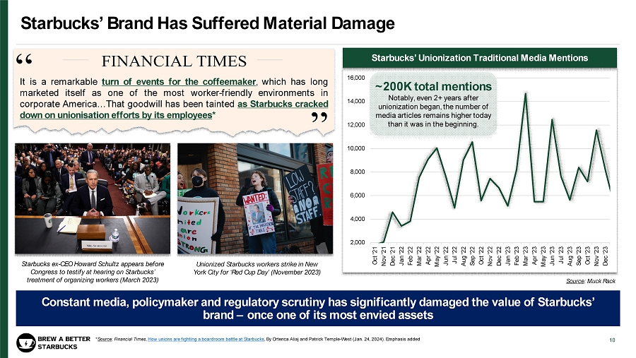 2,0004,0006,0008,00010,00012,000,00014,00016,000 Oct‘21 Nov’21 Dec‘21 Jan’22 Feb‘22 Mar’22 Apr‘22 May’22 Jul‘22 Jul’22 Aug‘22 Sep’22 Oct‘22 Nov’22 Dec‘22 Jan’23 Feb‘23 Mar’23 Apr‘23 May’23 Jul‘23 Aug’23 Sep‘23 Oct’23 Nov‘23 Dec’23 10 Constant Media,政策制定者和监管机构的审查严重损害了星巴克品牌的价值——曾经是其最令人羡慕的资产之一,星巴克的品牌遭受了物质损害,对于这家咖啡机来说,这是一个了不起的转折,长期以来,星巴克一直将自己标榜为美国企业中对工人最友好的环境之一……随着星巴克打击其员工的工会努力,这种善意受到了玷污*“”星巴克前首席执行官Howard Schultz出现在国会,在关于星巴克对待组织工人的听证会上作证(2023年3月)纽约市为‘红杯日’(2023年11月)举行的星巴克工会工人罢工*来源:金融时报,工会如何在星巴克打一场董事会之战,由Ortenca Aliaj和Patrick Temple-West(1月24日,2024 ) .强调添加来源:Muck Rack星巴克的工会化传统媒体提及~200K总提及值得注意的是,即使在工会化开始2 +年后,今天的媒体文章数量仍然比开始时要高。