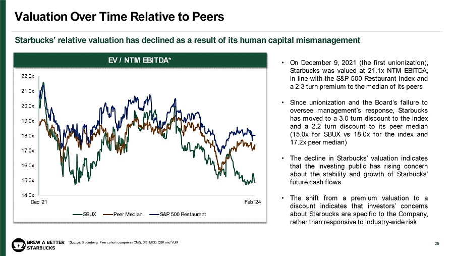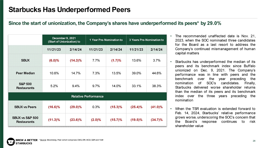 28星巴克的表现逊于同行•建议的不受影响日期是2023年11月21日,届时SOC提名了三名董事会候选人,作为解决公司在人力资本问题上持续管理不善的最后手段•自2021年12月9日Buffalo加入工会以来,星巴克的表现逊于同行及其基准指数的中位数。在SOC候选人提名前一年,该公司的表现与同行和基准一致。最后,星巴克在提名前三年的股东回报率低于同行及其基准指数的中值•当TSR评估向前延伸至2024年2月14日时,星巴克的相对表现变得更糟,这突显出SOC的担忧,即董事会的回应继续存在股东价值风险,即提名前3年至提名前1年至12月9日,2021(开始工会化)至2/14/2411/21/232/14/2411/21/232/14/2411/21/233.7% 13.6%(1.7)% 7.7%(14.3)%(6.0)% SBUX 44.6% 39.0% 13.5% 7.3% 14.7% 10.6%同业中值38.3% 33.1% 14.0% 9.7% 9.4% 5.2% 标普 500餐厅相对表现(41.0)%(25.4)%(15.3)% 0.3%(29.0)%(16.6)% SBUX vs同业(34.7)%(19.5)%(2.0)%(23.6)%(11.3)% SBUX vs 标普同行队列包括CMG、DRI、MCD、QSR和百胜餐饮集团,自工会开始以来,该公司的股票表现落后于同行* 29.0%
