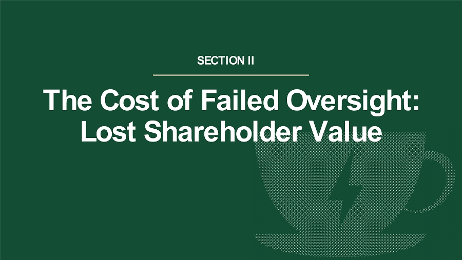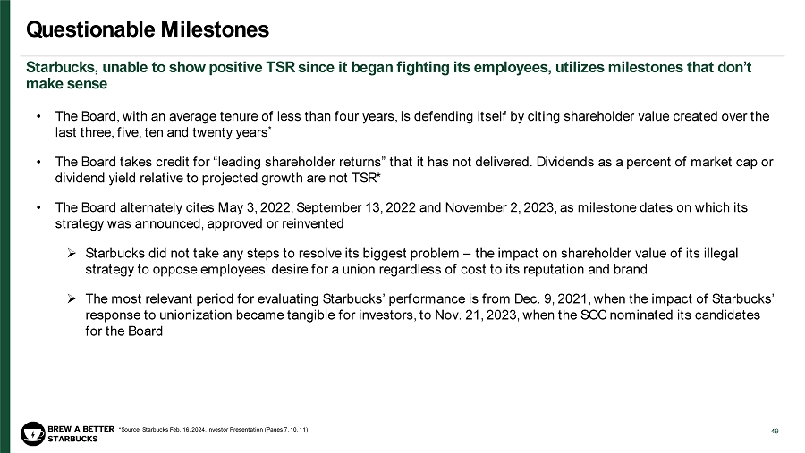 值得怀疑的里程碑49星巴克,自从开始与员工斗争以来,无法显示出积极的TSR,利用了没有意义的里程碑•平均任期不到四年的董事会通过引用过去三年、五年、十年和二十年创造的股东价值来为自己辩护* •董事会将其未能实现的“领先股东回报”归功于自己。股息占市值或股息收益率相对于预期增长的百分比不是TSR * •董事会交替引用2022年5月3日、2022年9月13日和2023年11月2日,作为其战略宣布、批准或重塑的里程碑日期»星巴克没有采取任何措施来解决其最大的问题——其反对员工希望建立工会的非法战略对股东价值的影响,而不考虑其声誉和品牌的代价»评估星巴克业绩的最相关时期是从2021年12月9日开始,当星巴克对工会化的回应对投资者的影响变得切实可见时,到2023年11月21日,SOC提名其董事会候选人*来源:星巴克2024年2月16日,投资者介绍(第7、10、11页)