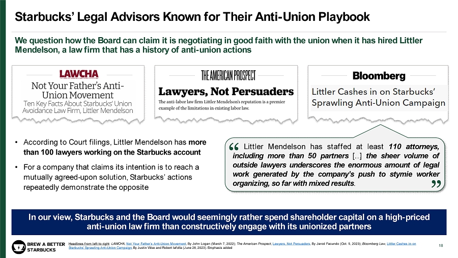 我们质疑,当董事会聘请了有反工会行动历史的律师事务所Littler Mendelson时,它如何能够声称它正在与工会进行善意的谈判18在我们看来,星巴克和董事会似乎宁愿将股东资本用于一家高价的反工会律师事务所,而不是建设性地与其工会合作伙伴星巴克的法律顾问进行接触,星巴克的法律顾问以其反工会剧本从左到右的头条新闻而闻名:LAWCHA,而不是你父亲的反工会运动,作者:John Logan(3月7日,2022);The American Prospect,Lawyers,not Persuaders,by Jarod Facundo(2023年10月5日);Bloomberg Law,Littler cash in on Starbucks ' sprawling anti-Union campaign,by Justin Wise and Robert Iafolla(2023年6月28日)。强调补充称“”利特勒·门德尔森至少配备了110名律师,其中包括50多名合伙人[…]外部律师数量之大,突显出该公司推动阻碍工人组织所产生的巨大法律工作量,迄今为止结果喜忧参半。•根据法庭文件,Littler Mendelson有100多名律师在为星巴克账户工作•对于一家声称其意图是达成双方同意的解决方案的公司来说,星巴克的行为一再表明了相反的情况