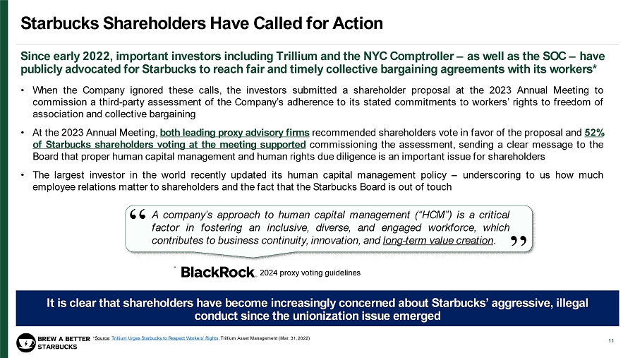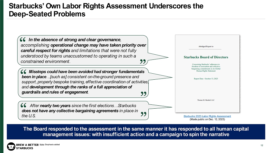 •当公司无视这些呼吁时,投资者在2023年年会上提交了一份股东提案,委托第三方评估公司遵守其对工人结社自由和集体谈判权利的声明承诺的情况•在2023年年会上,两家领先的代理咨询公司都建议股东投票支持该提案,在会上投票的星巴克股东中有52%支持委托评估,向董事会发出明确信息,即适当的人力资本管理和人权尽职调查是股东的一个重要问题•这家全球最大的投资者最近更新了其人力资本管理政策——向我们强调了员工关系对股东的重要性以及星巴克董事会脱节的事实11很明显,自工会问题出现以来,股东们越来越担心星巴克咄咄逼人的非法行为,星巴克股东自2022年初以来就要求采取行动,包括Trillium和纽约市审计长以及SOC在内的重要投资者公开倡导星巴克与员工达成公平、及时的集体谈判协议* A公司的人力资本管理方法(“HCM”)是培养一支包容、多样化和敬业的员工队伍的关键因素,这有助于业务连续性、创新和长期价值创造。“-2024年代理投票指引”*来源:Trillium敦促星巴克尊重工人权利,Trillium Asset Management(2022年3月31日)