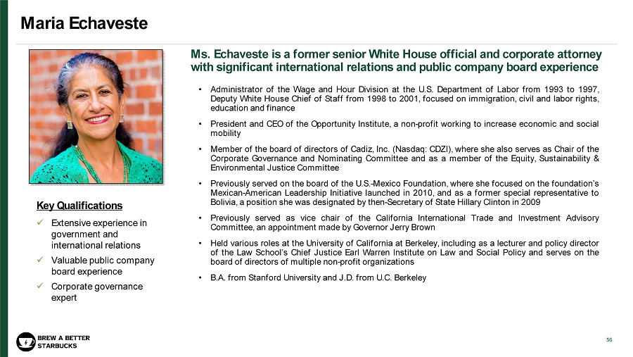 Maria Echaveste 38 Echaveste女士是前白宫高级官员和公司律师,拥有重要的国际关系和上市公司董事会经验,我们认为这将对星巴克董事会产生极大的补充作用Echaveste在指导公司从创始人指导的初创企业向运营公司过渡方面不可或缺。作为IBAT的独立董事,Echaveste帮助IBAT的创始人认识到需要一位新的CEO,他拥有建立适合上市公司的内部控制和应对进入外国市场的复杂性的适当专业知识,作为提名和治理委员会主席,Echaveste监督了该公司的领导层过渡,因为该公司在与环保组织持续二十年的诉讼和争议之后努力重新定位,从根本上说,独立董事的角色是以建设性和尊重的方式挑战管理层对某个情况或问题的评估,因为管理层和董事会都有增加股东价值的共同利益。