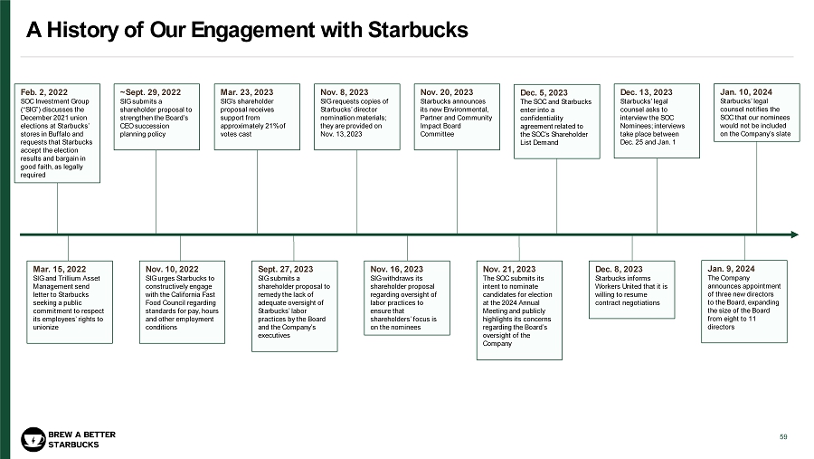 A History of Our Engagement with Starbucks 592022年2月2日SOC Investment Group(“SIG”)讨论了2021年12月在星巴克布法罗门店举行的工会选举,并要求星巴克接受选举结果并按照法律要求善意讨价还价,2022年3月15日SIG和Trillium Asset Management致函星巴克,寻求公开承诺尊重其员工加入工会的权利~2022年9月29日SIG提交了一份股东提案,以加强董事会的CEO继任规划政策。2023年3月23日SIG的股东提案获得了11月10日约21%的投票支持,2022 SIG敦促星巴克就薪酬、工时和其他雇佣条件的标准与加州快餐委员会进行建设性接触。2023年9月27日SIG提交了一份股东提案,以纠正董事会和公司高管对星巴克劳工做法缺乏充分监督的问题。2023年11月16日SIG撤回了关于监督劳工做法的股东提案,以确保股东的注意力集中在被提名人身上。2023年11月8日SIG要求提供星巴克董事提名材料的副本;这些材料于2023年11月13日11月21日提供,2023年SOC提交其在2024年年会上提名候选人的意向,并公开强调其对董事会对公司监督的担忧。2023年11月20日,星巴克宣布成立新的环境、合作伙伴和社区影响董事会委员会。2023年12月5日,SOC和星巴克就SOC的股东名单要求签订了保密协议。2023年12月8日,星巴克通知工人联合会,它愿意恢复合同谈判。2023年12月13日,星巴克的法律顾问要求采访SOC提名人;面试时间为12月25日至1月1日。9,2024年公司宣布任命三名新董事进入董事会,将董事会规模从8名扩大至11名董事2024年1月10日星巴克的法律顾问通知SOC,我们的提名人将不会被列入公司名单