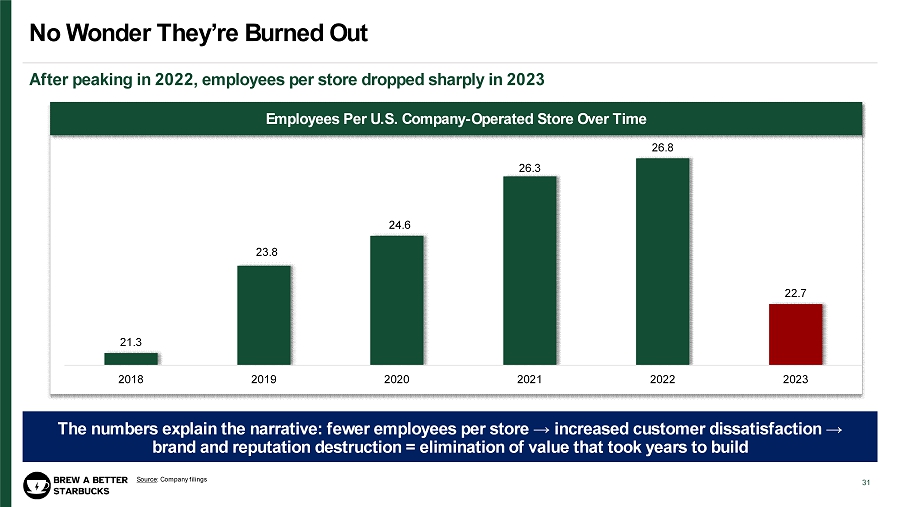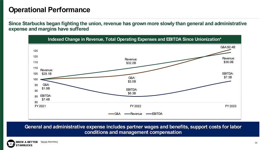 G & A:$ 2.0B收入:$ 36.0B收入:$ 29.1B收入:$ 32.2B G & A:$ 2.4B G & A:$ 1.9B EBITDA:$ 7.4B EBITDA:$ 6.3B EBITDA:$ 7.3B 80859095100105110115120125 FY 2021 FY 2022 FY 2023 FY G & A Revenue EBITDA 30一般和行政费用包括合伙人工资和福利、劳动条件支持成本和管理层薪酬运营绩效指数化的收入变化、总运营费用和自工会化以来的EBITDA *自星巴克开始与工会斗争以来,收入增长速度低于一般和行政费用,利润率受到影响*来源:彭博