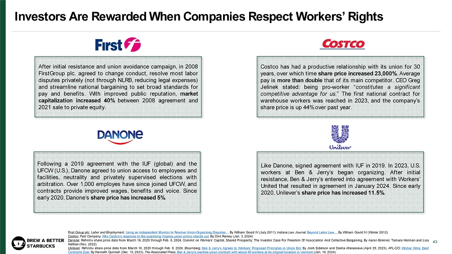继2019年与IUF(全球)和UFCW(美国)达成协议后,达能同意工会访问员工和设施、中立和私人监督的选举与仲裁。此后,已有超过1,000名员工加入了UFCW,合同提供了更好的工资、福利和发言权。自2020年初以来,达能股价已累计上涨5%。好市多与其工会有着30年的富有成效的合作关系,在此期间股价上涨了23,000%。平均薪酬是其主要竞争对手的两倍多。首席执行官Greg Jelinek表示:成为专业员工“对我们来说构成了重要的竞争优势。”2023年达成首份全国仓库工人合同,该公司股价较去年上涨44%。与达能一样,于2019年与IUF签署协议。2023年,Ben & Jerry's的美国工人开始组织起来。经过最初的抵制,Ben & Jerry’s与工人联合会达成协议,最终于2024年1月达成协议。自2020年初以来,联合利华的股价已累计上涨11。5 % .企业尊重工人权利43名投资者获奖励First Group PLC:劳动和就业,使用独立监视器解决工会-组织纠纷..。,by William Gould IV(2011年7月),Indiana Law Journal,Beyond Labor Law..。,作者:William Gould IV(Winter 2012)好市多:Fast Company,Why 好市多对令人惊讶的弗吉尼亚工会胜利的回应脱颖而出,作者:Clint Rainey(2024年1月3日)达能:Refinitiv 2020年3月16日至2024年2月8日期间的股价数据,致力于工人的资本,共享繁荣:协会自由和集体谈判的投资者案例,作者:Aaron Brenner、Tamara Herman和Lisa Nathan(2022年11月)联合利华:Refinitiv 2020年3月16日至2月8日期间的股价数据,2024年,彭博社,Ben & Jerry‘s同意工人在工会竞标中提出的原则,由Josh Eidelson和Dasha Afanasieva(2023年4月28日),AFL-首席信息官,工人获胜:有史以来的最佳合同,由Kenneth Quinnell(2023年12月15日),美联社报道,Ben & Jerry’s在经过最初的抵抗和工会回避运动后,于2008年同意改变行为,私下解决大多数劳资纠纷(而不是通过NLRB,减少法律费用),并简化国家谈判,为薪酬和福利设定广泛的标准。随着公众声誉的提高,从2008年协议到2021年出售给私募股权,市值增长了40%。