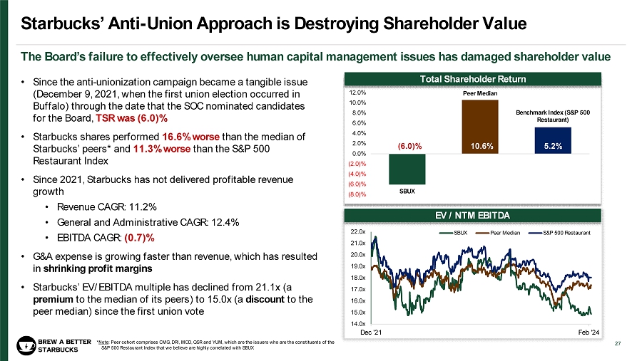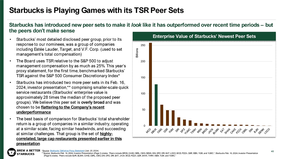 星巴克正在与其TSR同行套装进行博弈48家星巴克推出了新的同行套装,以使其看起来在最近一段时间内表现出色——但同行们说不通*来源:星巴克的最终委托书(2024年1月25日)* *来源:星巴克2024年2月16日,投资者介绍(第3页)称,“同行包括BROS、CAKE、CBRL、CMG、DENN、DIN、DPZ、TERM3、DRI、EAT、LOCO、TERM5、MCD、PZZA、QSR、WEN、YUM、YUMC。”;星巴克2020年2月16日PZZA、QSR、SHAK、TXRH、WEN、YUM、YUMC。”0501001502002500亿企业价值星巴克最新同行集•星巴克披露最详细的同行群体,在其对我们的提名做出回应之前,是一群公司,包括雅诗兰黛、塔吉特和威富公司(用于设定管理层的总薪酬)•董事会使用相对于标普 500指数的TSR来调整管理层薪酬,调整幅度高达25%。今年的代理声明首次将星巴克的TSR与标普 500非必需消费品指数进行对比* •星巴克在2024年2月16日的投资者介绍中又引入了两组同行,* *包括规模较小的快餐店(星巴克的企业价值约为拟议同行群体中位数的28倍)。我们认为,这一同行组合过于宽泛,被选中是为了讨好公司最近表现不佳•星巴克股东总回报的最佳比较基础是一组处于相似行业、以相似规模运营、面临相似逆风、并在类似挑战中取得成功的公司。该群体是本演示文稿前面介绍的一组高度相关的大型餐厅