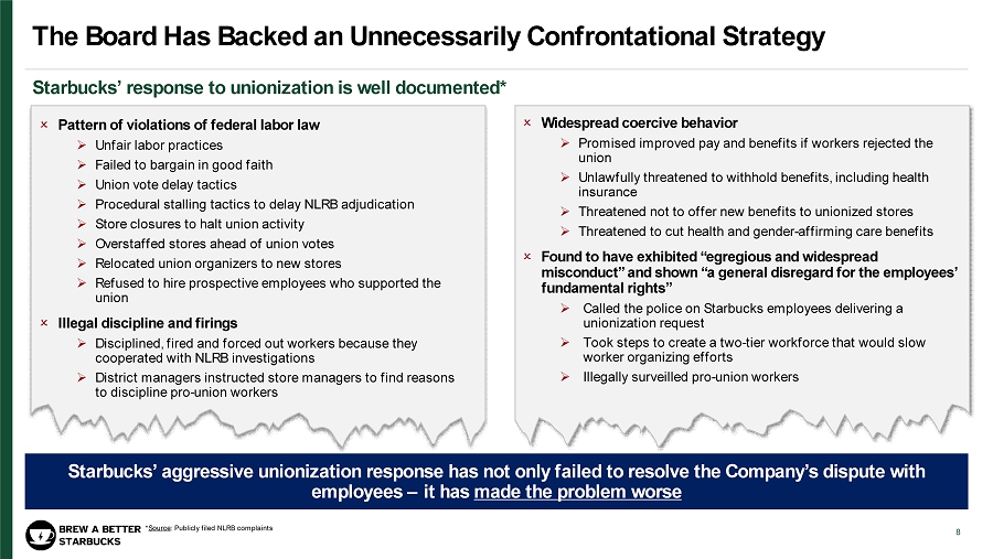 董事会支持了一种不必要的对抗策略8星巴克激进的工会反应并没有只是没能解决公司与员工的纠纷——这让问题变得更糟星巴克对加入工会的回应有据可查* *违反联邦劳动法的模式»不公平的劳工做法»未能善意讨价还价»工会投票拖延战术»拖延NLRB裁决的程序性拖延战术»关闭商店以阻止工会活动»工会投票前人员过多的商店»将工会组织者搬迁到新店中»拒绝雇用支持工会的潜在员工*违反纪律并被解雇»受到纪律处分,因配合NLRB调查而开除并逼退工人»地区经理指示店长找理由惩戒亲工会工人*普遍存在的胁迫行为»如果工人拒绝工会,承诺改善薪酬和福利»非法威胁扣留福利,包括健康保险»被威胁不向工会门店提供新福利»被威胁削减健康和性别肯定护理福利*被发现表现出“令人震惊和广泛的不当行为”,并表现出“普遍无视员工的基本权利”»就星巴克员工提出加入工会请求一事报警»采取措施创建两级劳动力,这将减缓工人组织工作的速度»被非法监视的亲工会工人*来源:公开提交的NLRB投诉